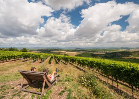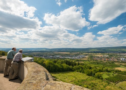 Gleich der nächste Tisch des Weins, gleich der nächste spannende Ausblick. Nicht umsonst stehen diese langen Tafeln an ganz besonderen Orten in Rheinhessen. Diesmal auf der Hiwweltour Eichelberg. Etwas ländlicher aber nicht minder schön, zeigt sich der Blick auf Neu-Bamberg in der Rheinhessischen Schweiz. Oberhalb des Ortes thront die Burgruine und in unmittelbarer Nähe befindet sich der Ajaxturm – ein Weinbergstürmchen mit einer der traurig-romantischsten Geschichten in Rheinhessen.
