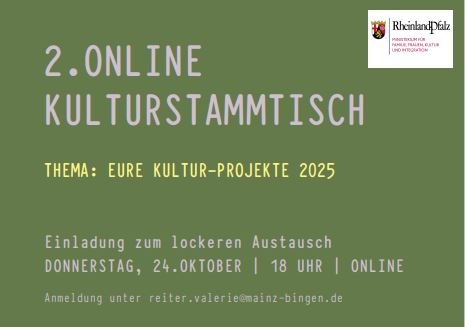 Das Treffen mit dem Thema: "Eure Kultur-Projekte 2025" findet am 24. Oktober 2024 um 18 Uhr statt.