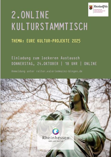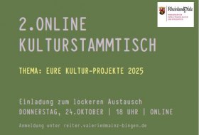 Valerie Reiter lädt Sie herzlich zum zweiten Online-Kulturstammtisch des Regionalen Kulturmanagements Rheinhessen am Donnerstag, den 24. Oktober 2024 um 18 Uhr ein.