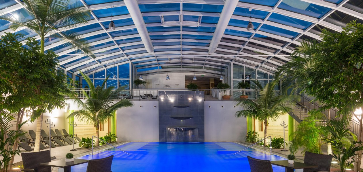 Die Wohlfühloase verfügt zudem über mehrere Pools, einen mit Salzwasser, einen auf dem Dach, über einen Dachgarten, ein Restaurant und Räume für Massagen und Kosmetik.