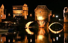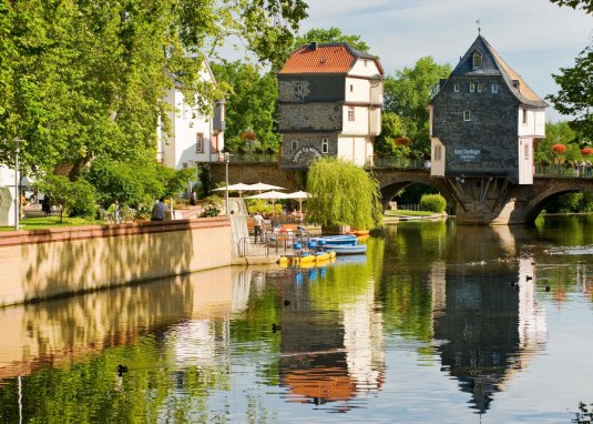 Die Alte Nahebrücke wurde um 1300 als große Pfeilerbrücke mit acht Bögen errichtet. Sie überspannte den Hauptarm der Nahe und den Mühlenteich. Sie war Teil der Stadtmauer. Die Brückenhäuser sind Fachwerkbauten und wurden zwischen 1500 und 1600 errichtet und sind in die Brückenpfeiler gebaut. Das ist eine sehr seltene Form von Brückenarchitektur. Die Brückenhäuser, die benachbarte Pauluskirche und der Mühlenteich bilden ein einzigartiges Ensemble, das zu den beliebtesten Fotomotiven des Landes zählt. Die Doppelbrücke verbindet die beiden Stadtteile Historische Neustadt und Altstadt, die die mittelalterliche Stadt prägten.