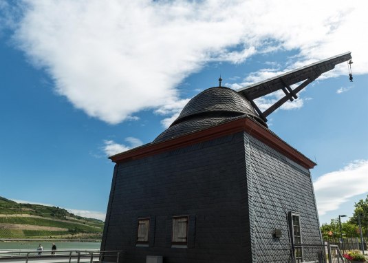 Der alte Rheinkran steht neben der ehemaligen Zollverwaltung am Kulturufer Bingen. Schon im 15. Jahundert ist hier ein Kran überliefert. Der jetzige Dreh- und Auslegerkran wurd wohl ab 1613 nach Plänen des Aschaffenburger Baumeisters Riedinger erbaut. Nach einer Erneuerung im Jahre 1819 bewahrte man das Bauwerk durch das damalige neue Denkmalschutzgesetz 1907 vor dem Abriss. Im Zweiten Weltkrieg schwer beschädigt, wurde der Kran ab 1950 wieder hergestellt und im Zeitraum von 2005-2007 funktionstüchtig restauriert.