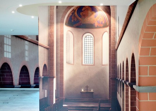 Hildegard von Bingen verließ zwischen 1147 und 1151 ihr Heimatkloster auf dem Disibodenberg und gründete an der Nahe ihr Kloster auf dem Rupertsberg. In ihren knapp 30 Jahren auf dem Rupertsberg verfasste sie ihre Hauptwerke. Während des Dreißigjährigen Krieges wurde das Kloster zerstört. Von der Klosterkirche sind nur sechs Pfeiler der südlichen Mittelschiffwand erhalten. In der Villa am Rupertsberg ist – ausgehend von den Original-Klosterarkaden aus der Hildegard-Kirche – das verschwundene Hildegard-Kloster „wiedererstanden“ und kann mithilfe digitaler Technik mit allen Sinnen entdeckt werden: Erleben Sie, wie der verschwundene Chor durch virtuelle Rekonstruktion und ein wenig optische Täuschung die Original-Überreste so ergänzt, dass man sich inmitten der Hildegard-Kirche wiederfindet.