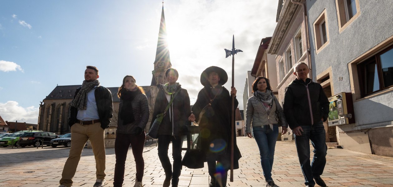 Kostümführung durch das abendliche Alzey. Begleiten Sie unseren Nachtwächter durch die alten Gassen der Stadt Alzey. In historischem Gewand, mit Hellebarde und Laterne ausgestattet, beginnt er bei Anbruch der Dunkelheit seine Runde und macht an verschiedenen Stationen Halt, um Historisches und Anekdotisches zu erzählen.
