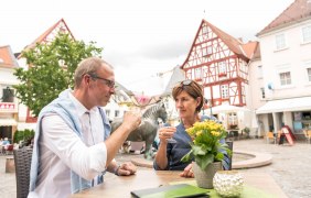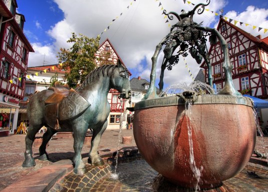 Der Rossmarkt stellt die "Drehscheibe" Alzeys dar und ist damit zugleich das vitale, pulsierende Herz der Stadt. Zusammen mit dem angrenzenden Fischmarkt dürfte er der eigentliche "Marktplatz" der Stadt gewesen sein. Sein Name geht auf einen hier in früheren Zeiten abgehaltenen Pferdemarkt zurück. Geprägt wird der Platz heute zum einen von dem "Rossmarktbrunnen", den der Neustädter Künstler Gernot Rumpf 1985 geschaffen hat. Das an der Brunnentränke stehende, üppig proportionierte Ross des Spielmanns und Ritters Volker von Alzey lädt vor allem Kinder dazu ein, sich in den Sattel zu schwingen und fotografieren zu lassen. Daneben sind es zum anderen die beiden giebelseitig zum Platz stehenden Schmuckfachwerkhäuser des 17. und frühen 18. Jhs., die baulich dem Platz seinen ansprechenden Charakter geben.