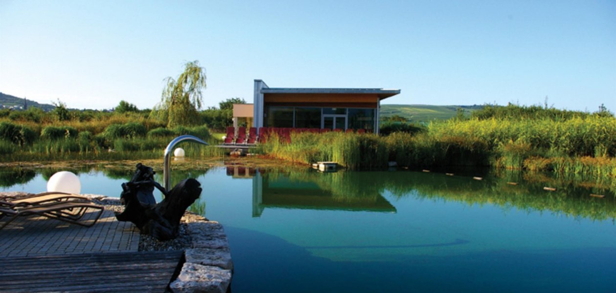 Im Außenbereich der Saunawelt befinden sich gleich fünf unterschiedliche Saunen. Hier sorgt der naturnah gestaltete Badeteich, in dem die Besucher ihre Runden drehen können, für Abkühlung.