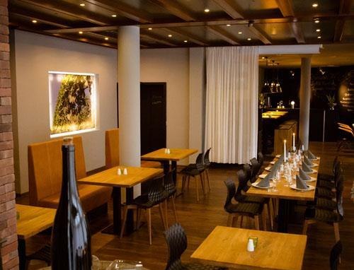 und trotzdem bodenständig. Cognacfarbene Bestuhlung, Tische aus massivem Eichenholz strahlen