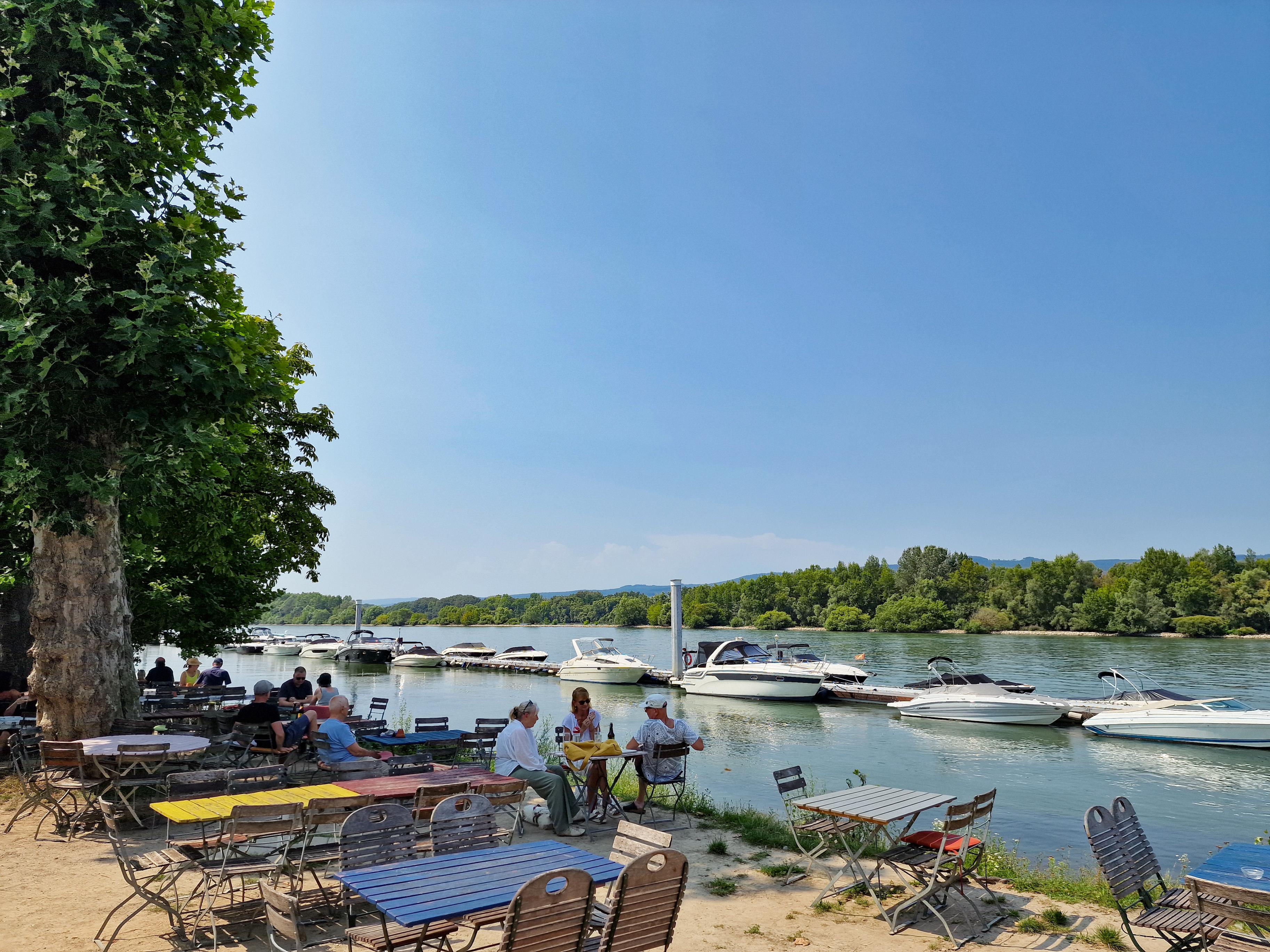 Direkt am Rheinufer bei Heidesheim-Heidenfahrt, mit Blick auf das Naturschutzgebiet Inselrhein, lädt der Wein- und Biergarten zum Genießen und Verweilen ein. Angeboten werden hochwertige, regionale Spezialitäten sowie Spitzenweine aus Rheinhessen, dem Mittelrhein und dem Rheingau – dazu passende Gerichte wie Flammkuchen, Vegetarisches oder auch mal heimisches Lamm und Wild. Das familienfreundliche Ausflugsziel liegt am Rheinradweg und bietet mit einem großen Zelt jetzt auch Witterungsschutz. Unter alten Platanen oder direkt am Ufer den Sonnenuntergang erleben, auf dem Campingplatz übernachten, vom Bootssteg zur Rheintour starten oder den Grillplatz nutzen – so fühlt sich eine kleine Auszeit vom Alltag an.