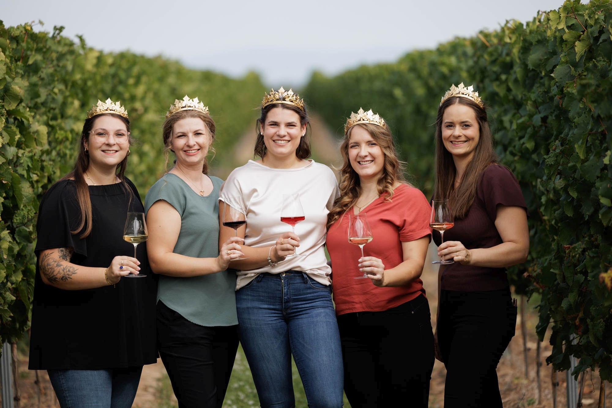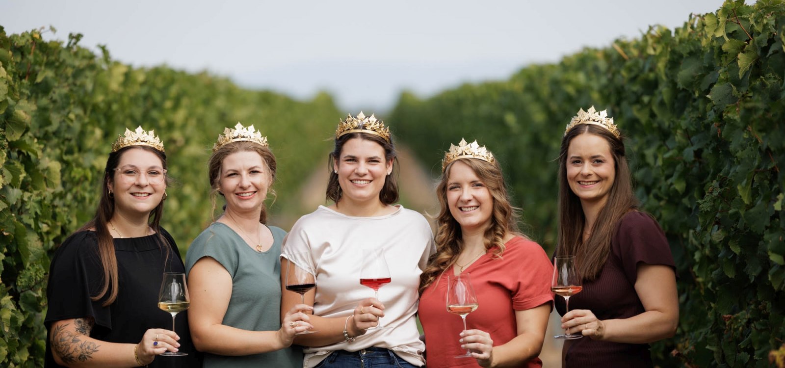 Rheinhessische Weinkönigin 2023-2024 mit ihren Weinprinzessinnen Lena, Tamina, Eleni und Eva