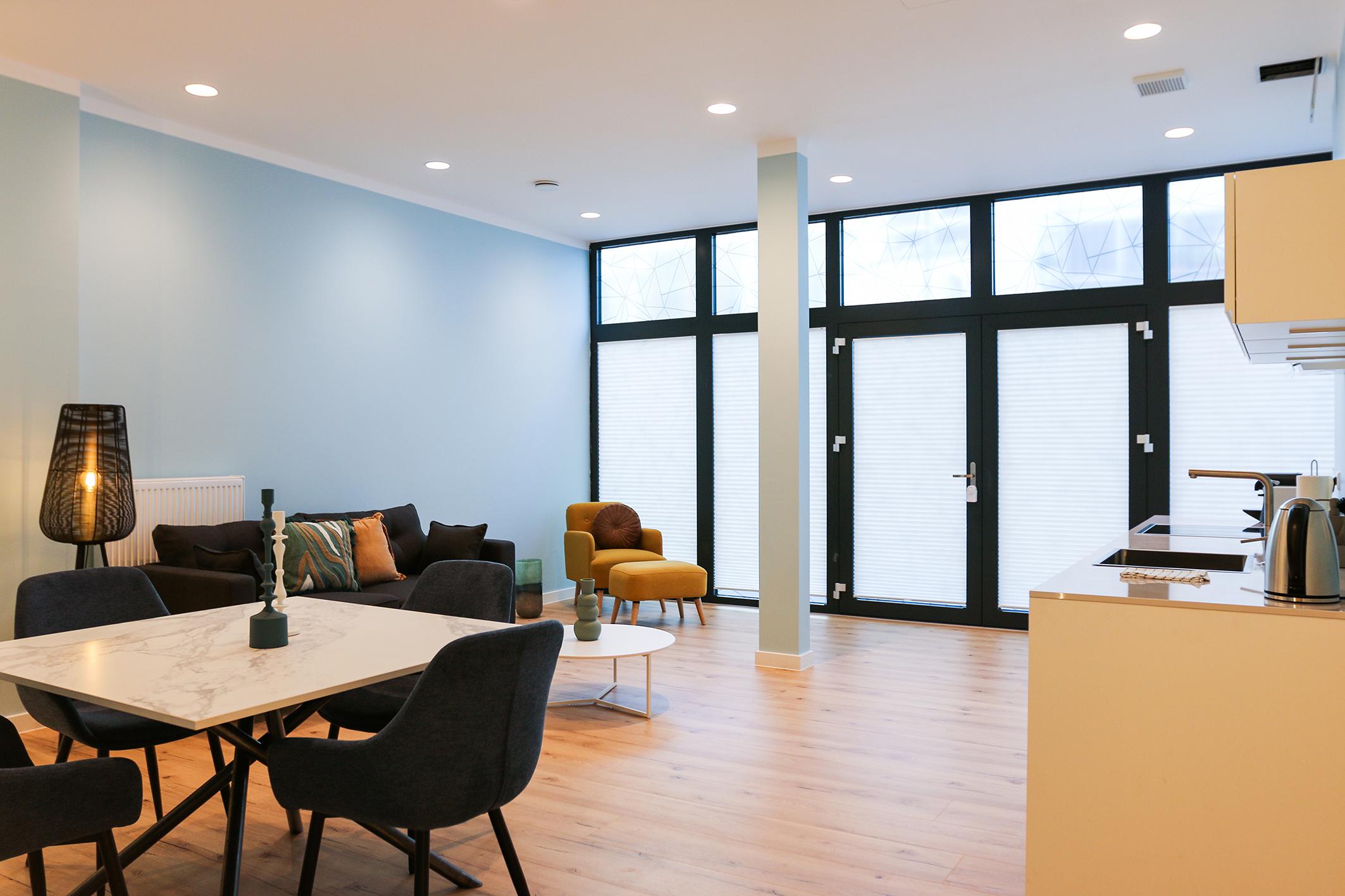 Die 65 qm große Ferienwohnung verfügt über einen offenen, großzügigen Wohn- und Schlafbereich mit King-Size Boxspringbett und bequemer Couch, eine komplett ausgestattete Küche mit Geschirrspüler, Herd, Geschirr sowie einem Kühlschrank und ein modernes Badezimmer inklusive Waschmaschine und begehbarer Dusche. Neben dem Bett befindet sich ein Kinderbett (70-140cm) sowie ein Hochstuhl im Esszimmer und Geschirr für ein Kind. Handtücher und Bettwäsche werden gestellt. Da die Wohnung über keine öffenbare Fenster verfügt, wurde ein modernes Lüftungssystem eingebaut, welches dauerhaft Frischluftzufuhr gewährleitet.