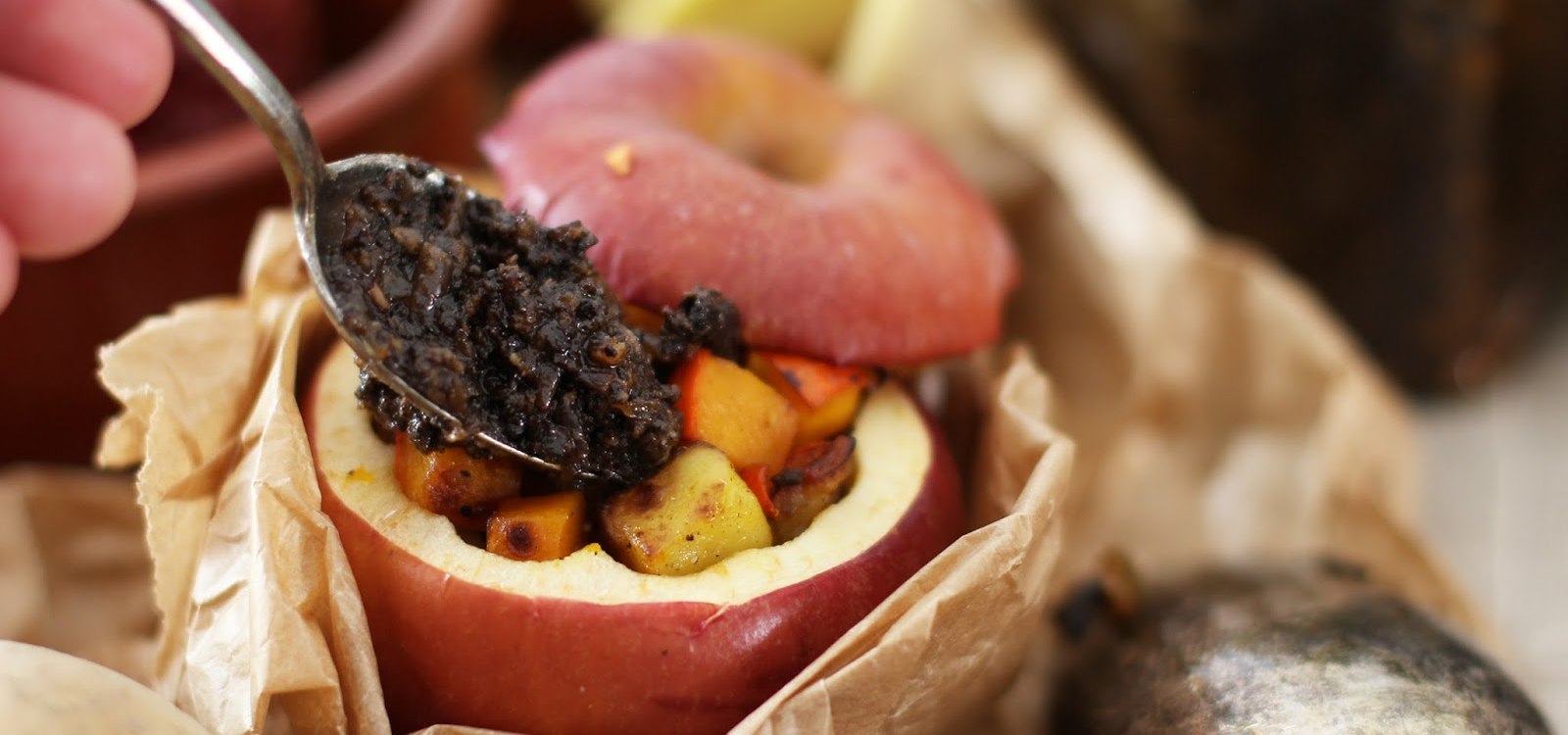 Bratapfel mit Kürbis-Kartoffel-Füllung und Blutwurst-Jam