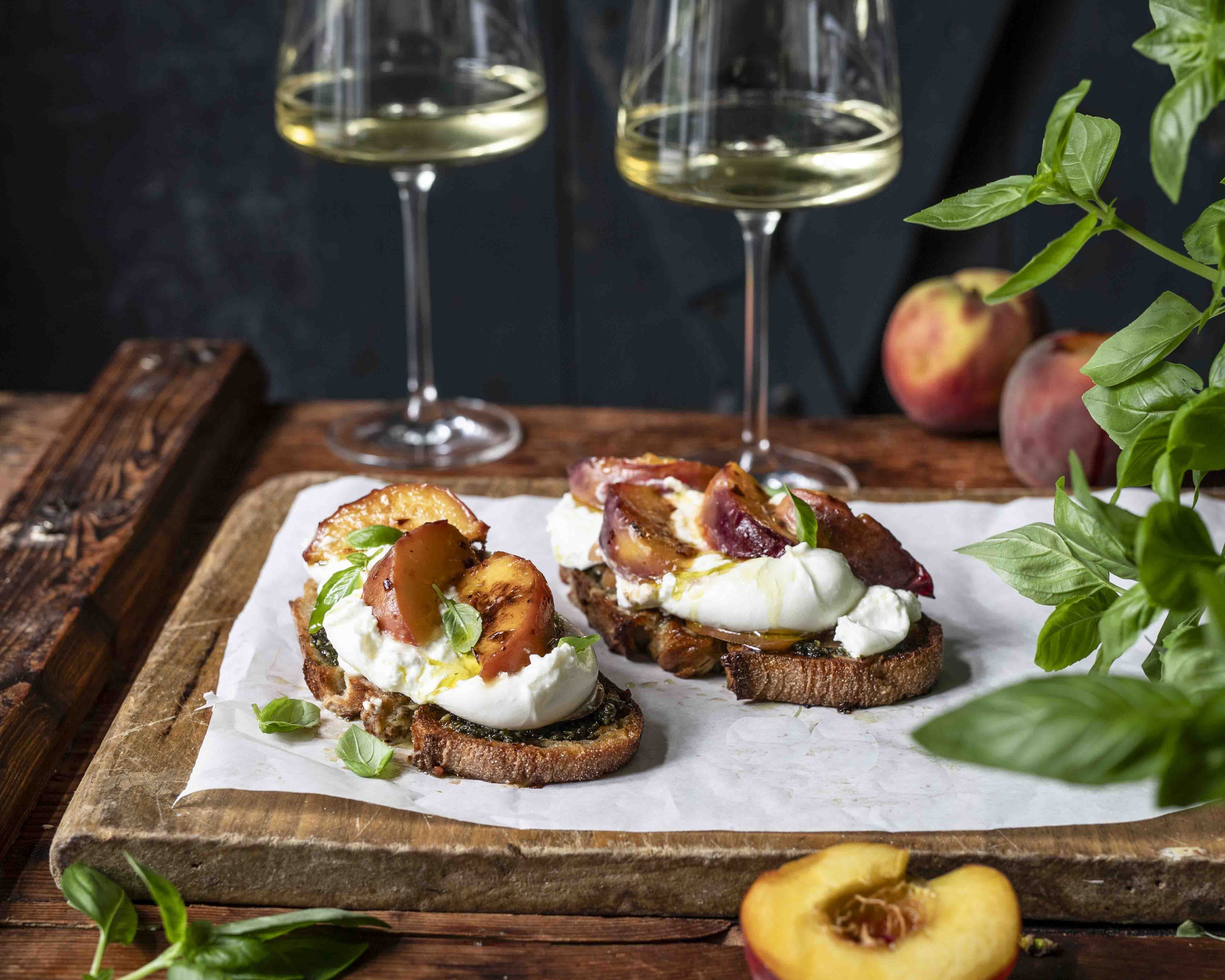 Burrata-Pesto-Stulle mit Pfirsich und Traubenkernöl