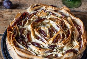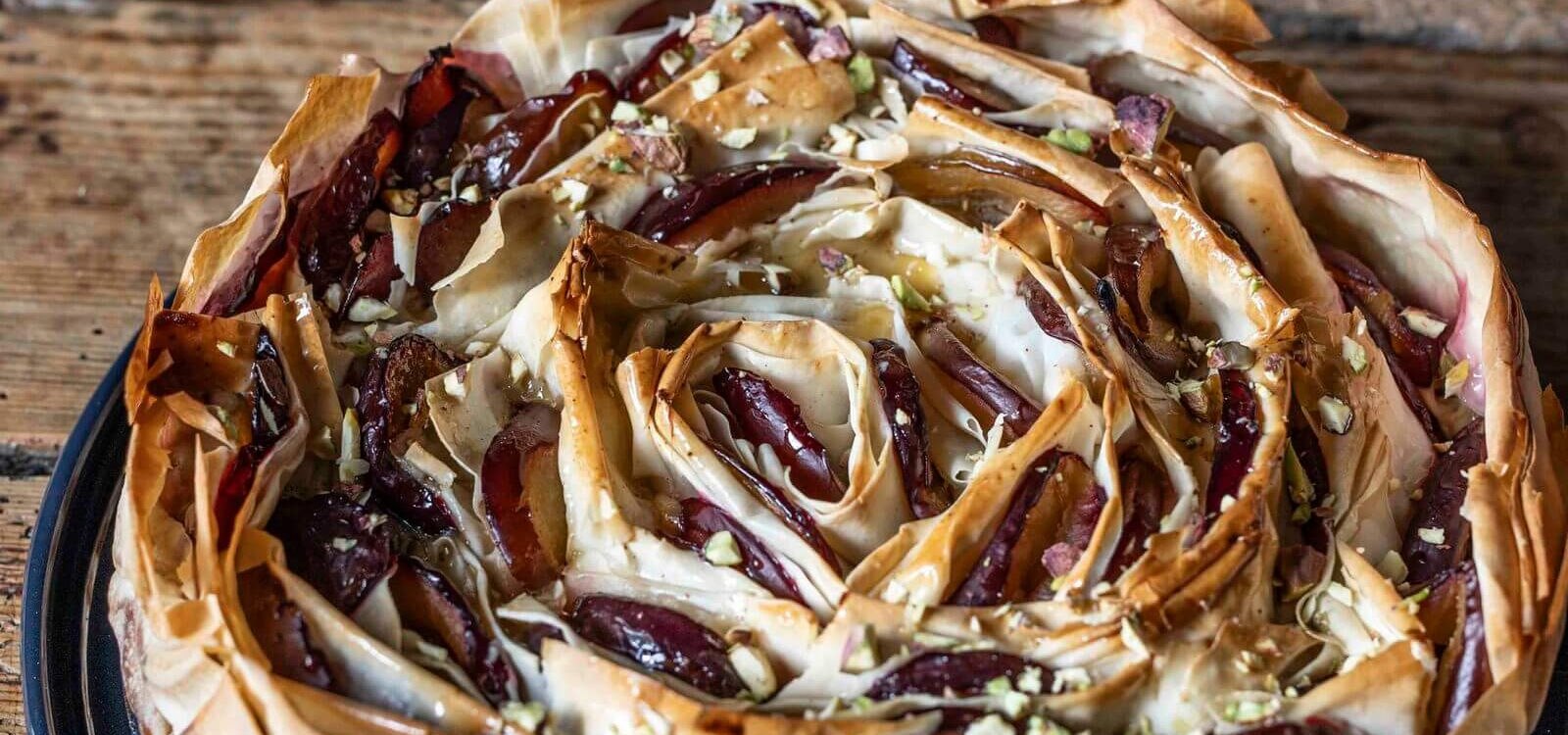 Springform fetten. Zwei Lagen Filoteig über Kreuz in die Springform legen, so dass sie einen Boden bilden. Nun nacheinander eine Lage Filoteig mit etwas Milch einpinseln und so lange im Zickzack Falten bilden, bis der Teig vollständig gefaltet ist. (Die Falten sollten etwa 3 cm hoch sein) Das erste Stück als Schnecke in der Mitte der Springform platzieren. Mit den anderen Teigseiten genauso verfahren und die immer um die Schnecke herum legen. Dabei darauf achten, dass die Falten nicht zu eng gedrückt werden.