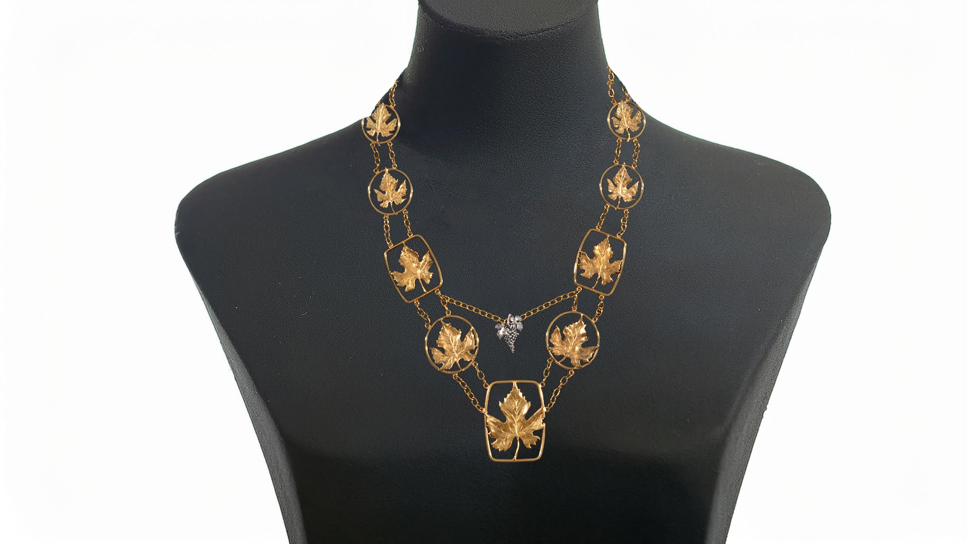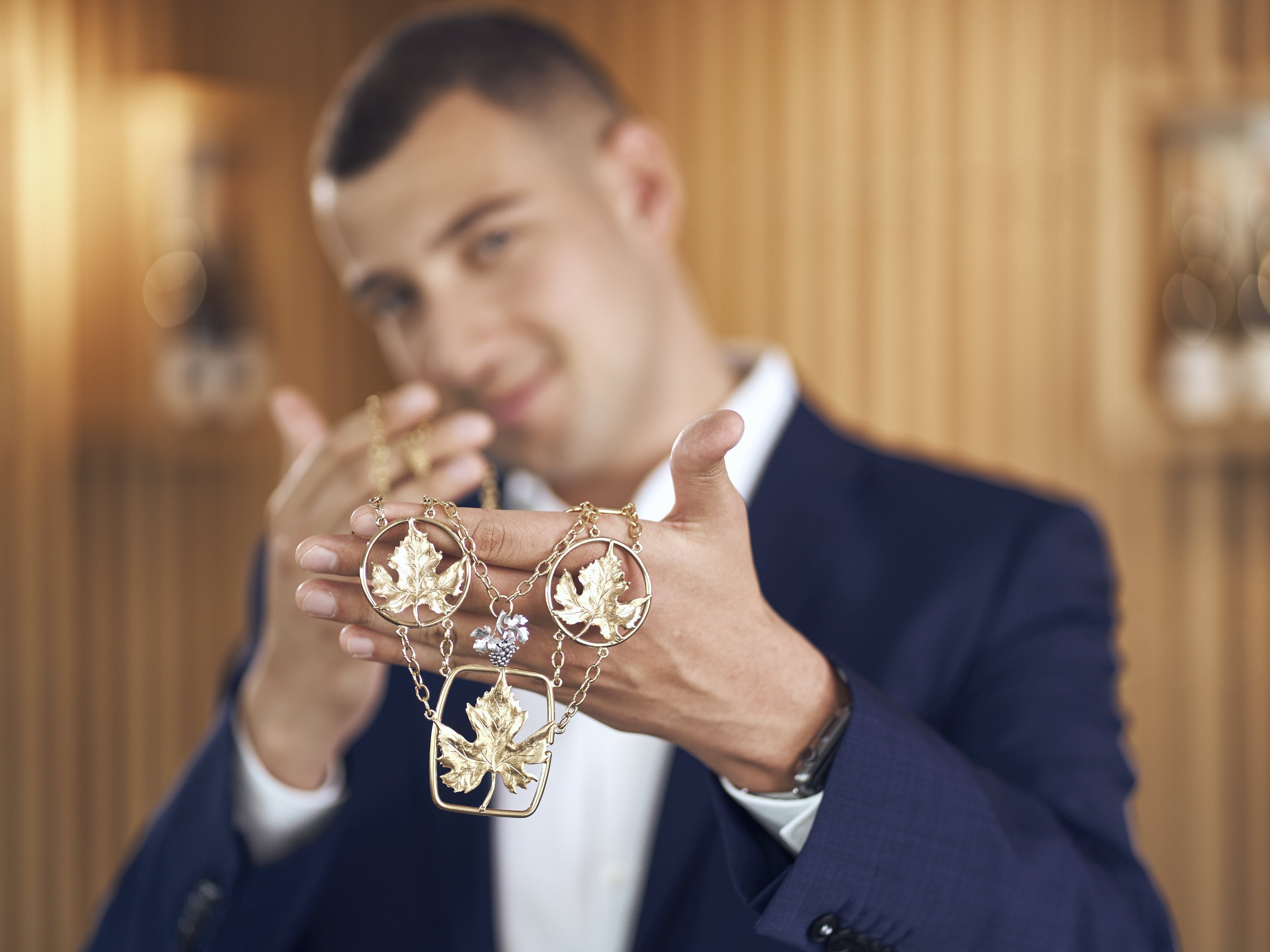 Die kunstvollen Weinblätter aus Messing werden auf die sorgfältig handgefertigten Rahmenelemente unter offener Flamme bei 650–700°C aufgelötet. Während des Lötprozesses werden zudem die Verbindungsösen für die einzelnen Kettenglieder angebracht. Jedes Bauteil wird mit Silberhartlot befestigt, um höchste Stabilität und Langlebigkeit sicherzustellen. Nachdem alle Elemente miteinander verbunden wurden, erhält die Kette ihre finale Oberfläche: Die runden Messingrahmen werden hochglanzpoliert, während die Blätter eine matte Textur erhalten, was einen faszinierenden Kontrast zwischen den glänzenden und matten Elementen schafft. Der endgültige Glanz wird durch eine galvanische Vergoldung verliehen, die der Kette eine luxuriöse Ausstrahlung verleiht.