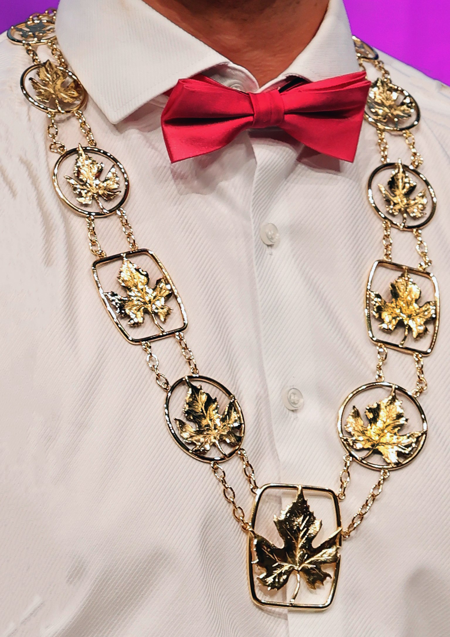 Zum Abschluss werden die einzelnen Elemente durch filigrane Ösenketten miteinander verbunden. Ein flexibles Verschlusssystem mit Zwischenösen und einem kleinen, gekrönten Traubenanhänger als finalem Detail erlaubt es, die Kettenlänge individuell anzupassen und verleiht der Kette einen charmanten Abschluss, der mit einem kleinen Augenzwinkern an die Würde und Tradition des Amtes erinnert.