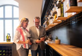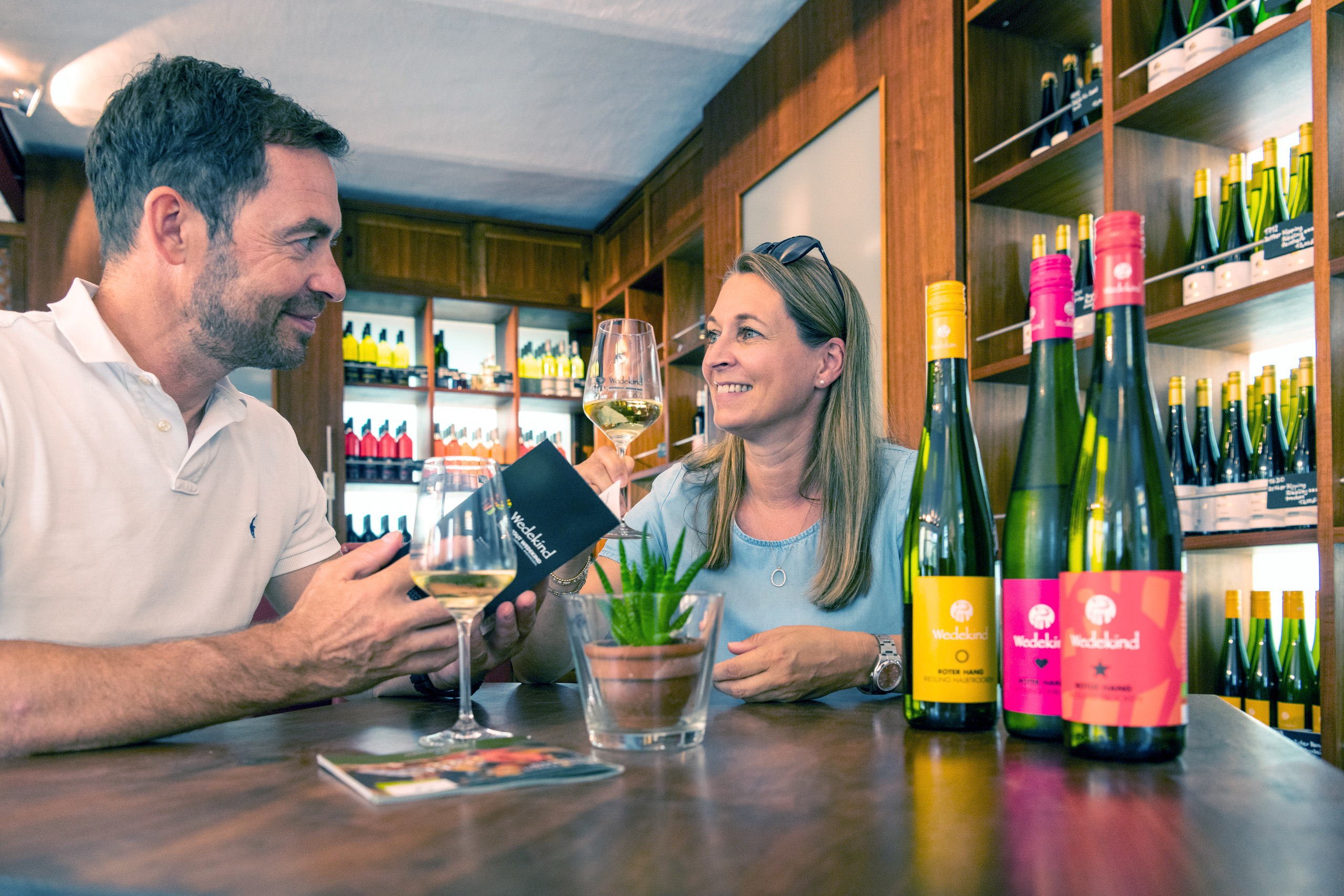 Aber keine Sorge – man kann gerade jetzt auch ganz wunderbar altmodisch stöbern. So viele schöne Spezialitäten neben dem Wein gibt es sonst nicht. Zu Traubensaft, Weingelee und Rieslingessig gesellen sich Produkte aus regionalem Obst oder Gemüse. Ein Kürbis-Apfel-Chutney mit einem Schuss Scheurebe passt garantiert zum Lieblingskäse. Kulinarische Spezialitäten wie Öle, Essige und Pestos sind im Angebot – als Geschenk oder für das eigene Festtagsmenü. Eierbecher aus Fassdauben! Glühweingelee! Handgemachte Pralinen!