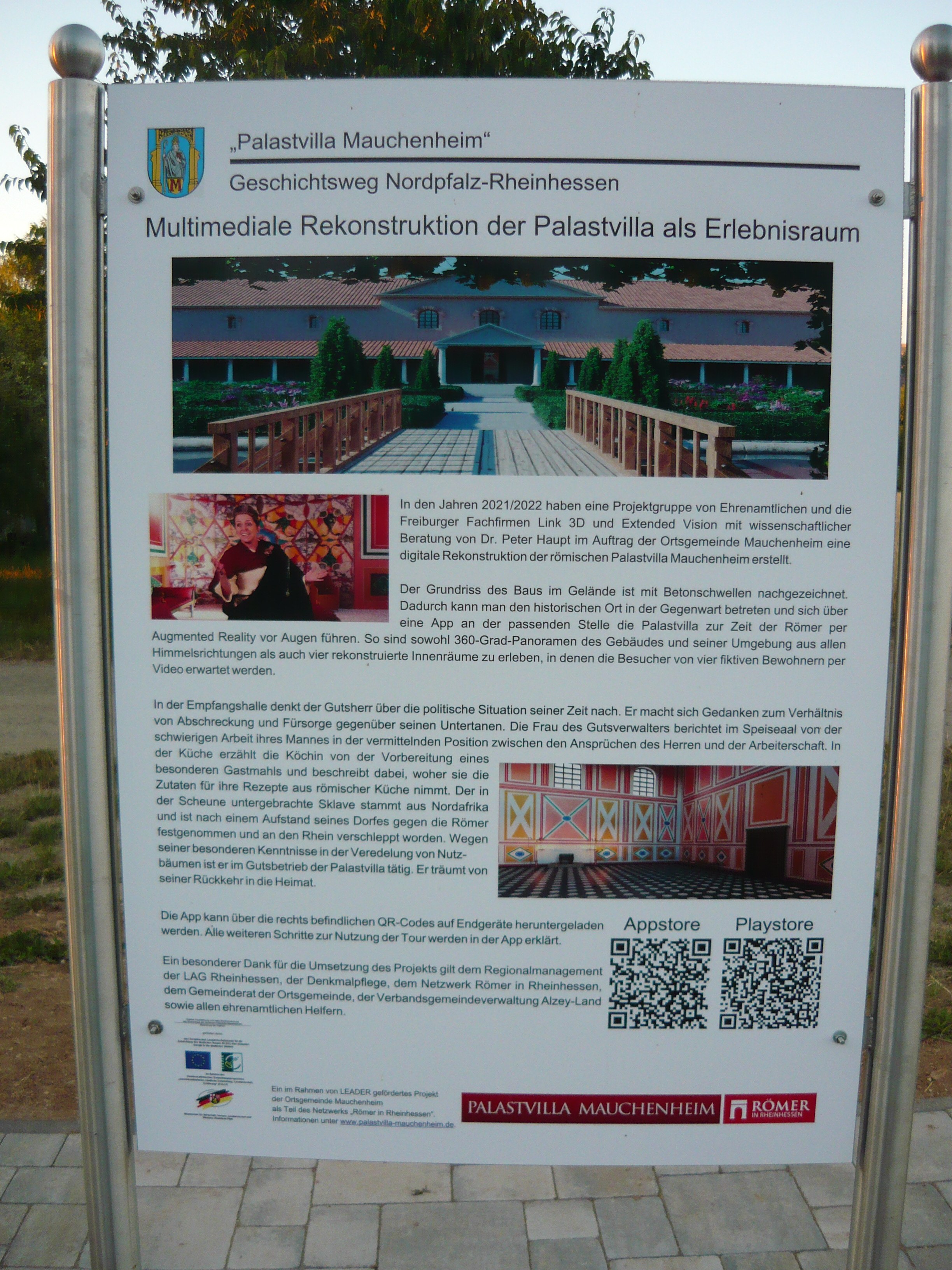 In dem Vorhaben der Ortsgemeinde Mauchenheim soll die römische Palastvilla, die überregional eine große Bedeutung hat, mit immersiven Medien (Augmented- und Virtual Reality) erlebbar gemacht werden. Die digitale Rekonstruktion außen und innen in 3 D ist didaktisch flexibel und fügt sich in das Dachprojekt „Römer in Rheinhessen“ ein. Der Grundriss der Palastvilla soll im Gelände mit Betonschwellen sichtbar und erlebbar gemacht werden.