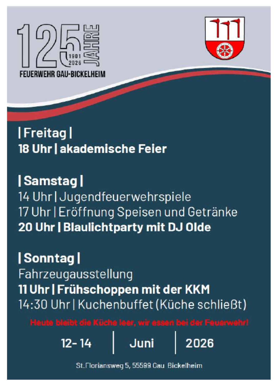 Freitag:akademische Feier (18 Uhr)Samstag:Jugendfeuerwehrspiele (14 Uhr)Eröffnung mit Essen (17 Uhr)Blaulichtparty mit DJ Olde (20 Uhr)Sonntag:Frühschoppen mit der KKM (11 Uhr)Kuchenbuffet (14:30 Uhr)Fahrzeugausstellung