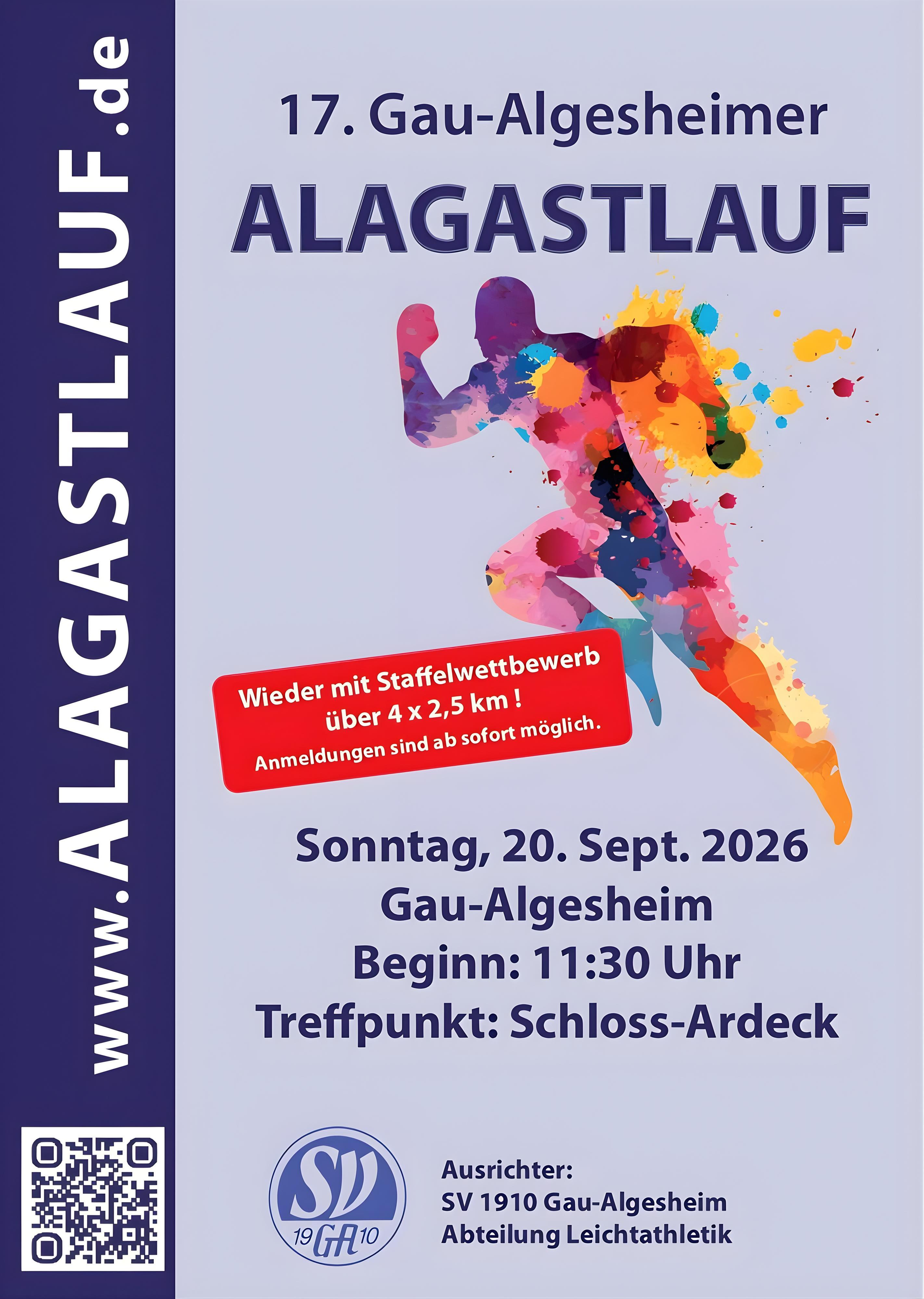 Organisiert vom SV 1910 Gau-Algesheim wird der Alagastlauf auch 2026 wieder zu einem sportlichen Highlight für die ganze Familie, für Freunde und alle, die Freude an Bewegung haben.