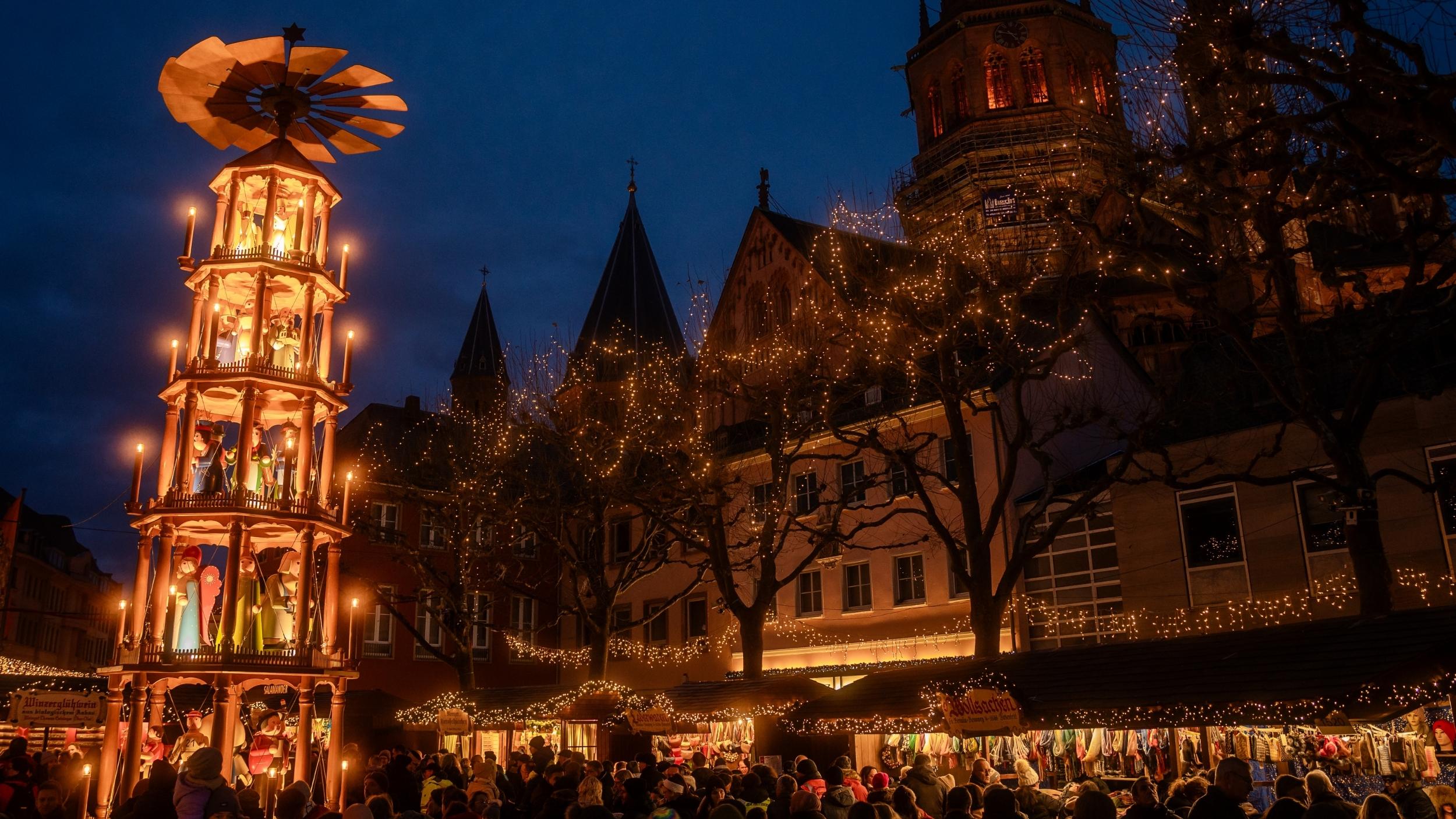 Vor der eindrucksvollen Kulisse des über 1.000 Jahre alten Mainzer Doms St. Martin erstrahlt der Marktplatz zur Adventszeit in einem Meer aus Lichtern, Düften und festlicher Musik. Zwischen den liebevoll dekorierten Ständen entfaltet sich die ganze Magie der Weihnachtsstadt Mainz. Gleich am Haupteingang des Marktes ragt die elf Meter hohe, reich verzierte Weihnachtspyramide empor und zieht Besucher:innen schon von Weitem in ihren Bann. Nur wenige Schritte weiter beeindrucken die handgeschnitzten, lebensgroßen Krippenfiguren vor der Gotthardkapelle des Doms. Die farbenfrohen Renaissance-Fassaden der historischen Markthäuser verleihen dem Markt zusätzlich ein ganz besonderes Flair. Ein Karussell, handgemachtes Spielzeug und die neun Meter hohe Spieluhr mit ihren 18 geschnitzten Engelsfiguren lassen nicht nur Kinderaugen leuchten.