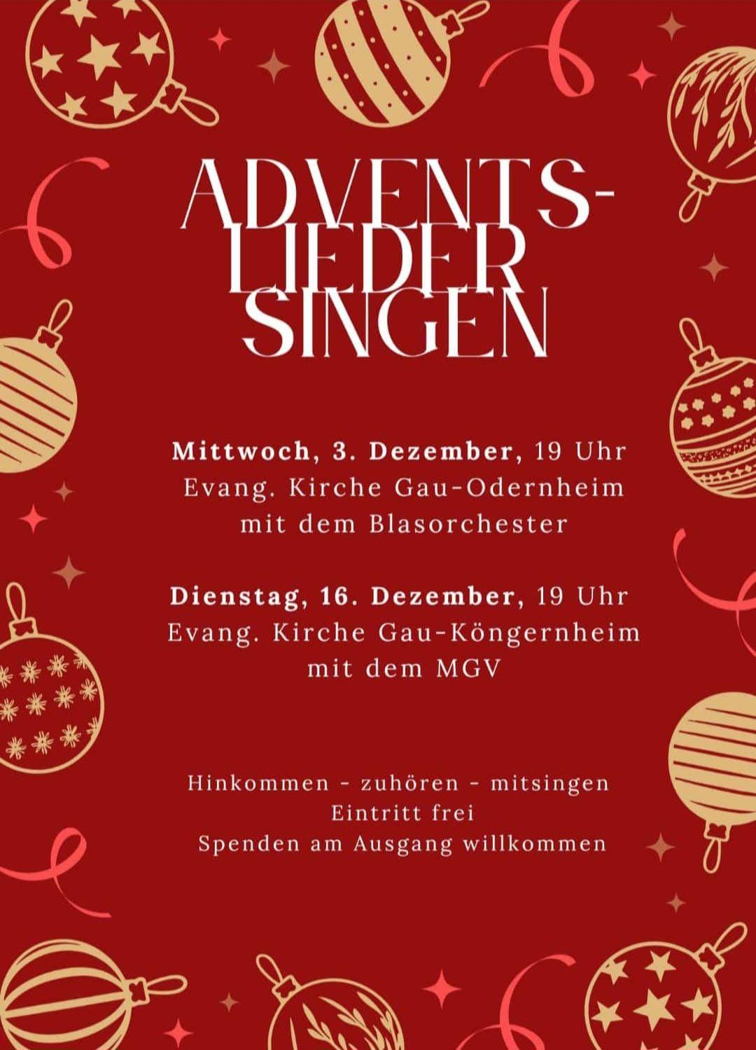 Adventsliedersingen in der Evangelischen Kirche in Gau-Köngernheim mit dem Männergesangverein. Hinkommen - zuhören - mitsingen. Der Eintritt ist frei, Spenden am Ausgang sind willkommen.
