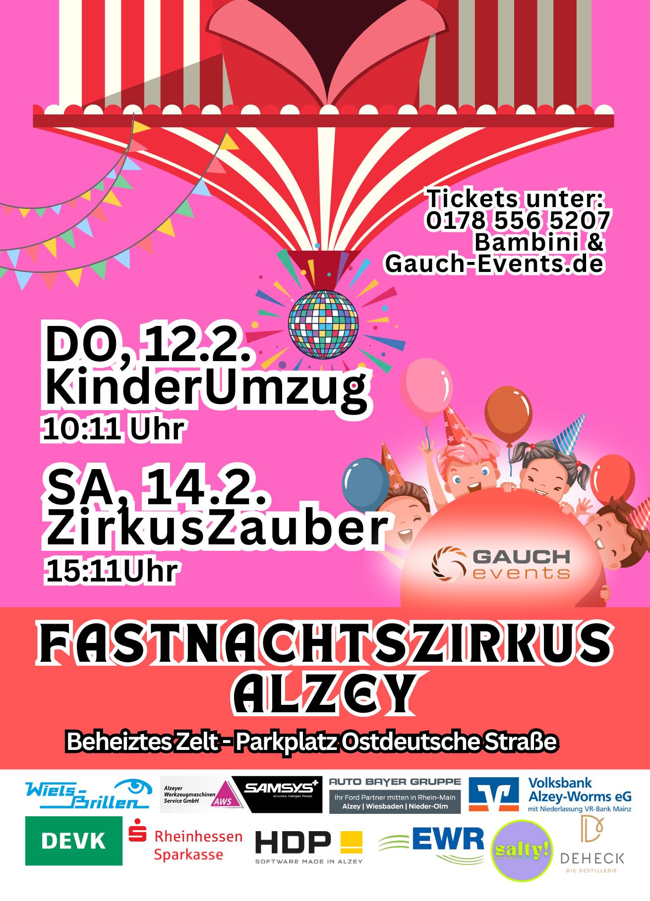 Der große KinderUmzug - Fastnachtszirkus Alzey. Beginn 10:11Uhr. Start und Ende am Parkplatz der Ostdeutschen Straße. Zirkusparty im Anschluss. Detailiierte Infos beim Veranstalter www.gauch-events.de