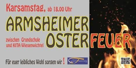Am 04.04.2026 veranstaltet der Verein "Zukunft braucht Tradition e.V." das traditionelle Osterfeuer in Armsheim zwischen der Grundschule und der KITA Wiesenwichtel. Für das leibliche Wohl ist gesorgt.