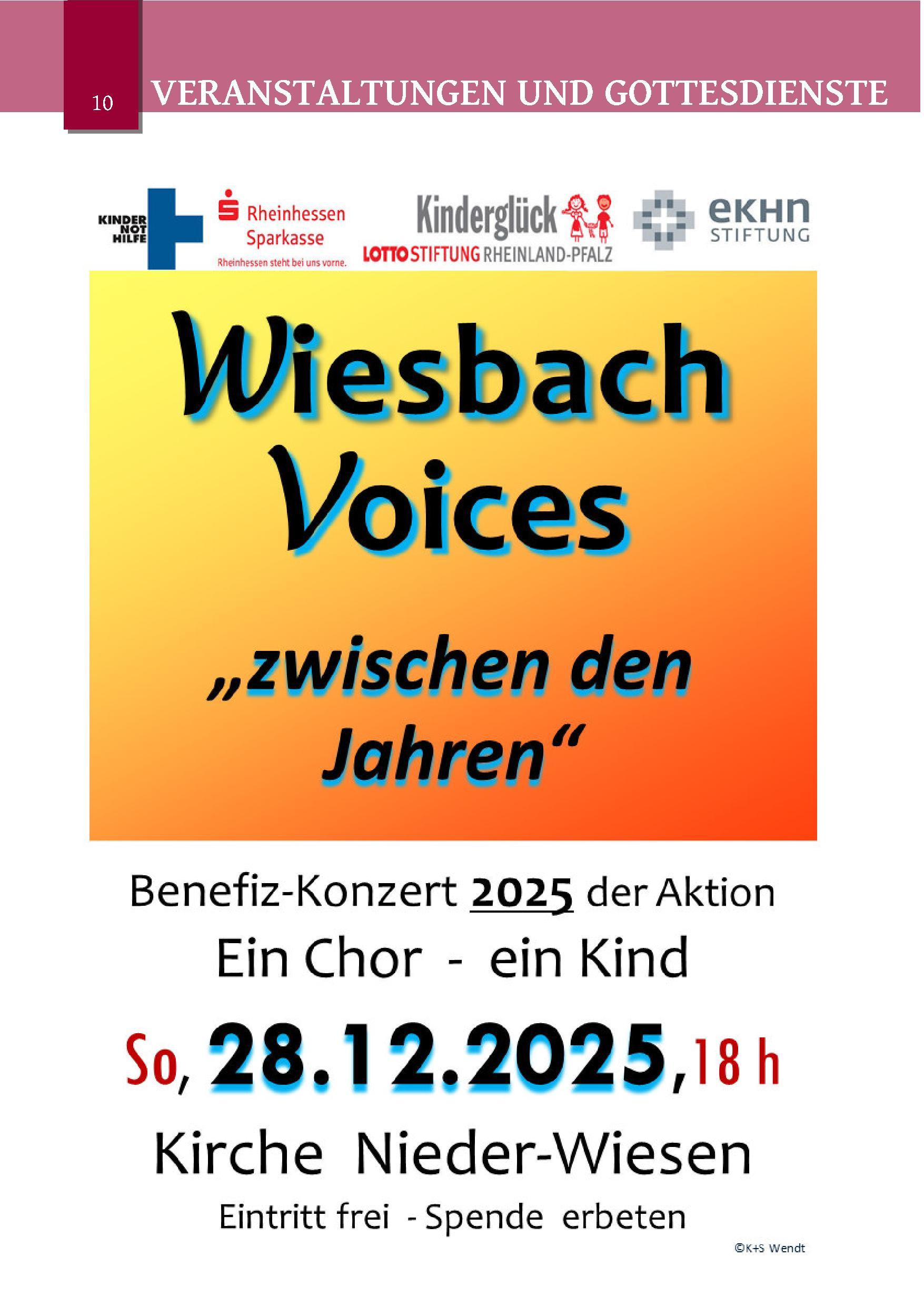 Die Benefizaktion begann 2010 als einmaliges Konzert, entwickelte sich jedoch zu einer jährlichen Tradition und brachte bisher über 30.000 € für Projekte der Kindernothilfe ein. Dank großzügiger Unterstützung von Sponsoren wie Lotto Rheinland-Pfalz, der Rheinhessen-Sparkasse und der evangelischen Kirchengemeinde konnte so vielen Kindern weltweit geholfen werden. Der ausschließlich ehrenamtliche Chor aus Nieder-Wiesen erhielt selbst Anerkennung, unter anderem durch eine CD-Produktion und professionelle Stimmbildung. Auch in diesem Jahr hofft der Chor wieder auf eine gut gefüllte Kirche und ein erfolgreiches Spendenergebnis.