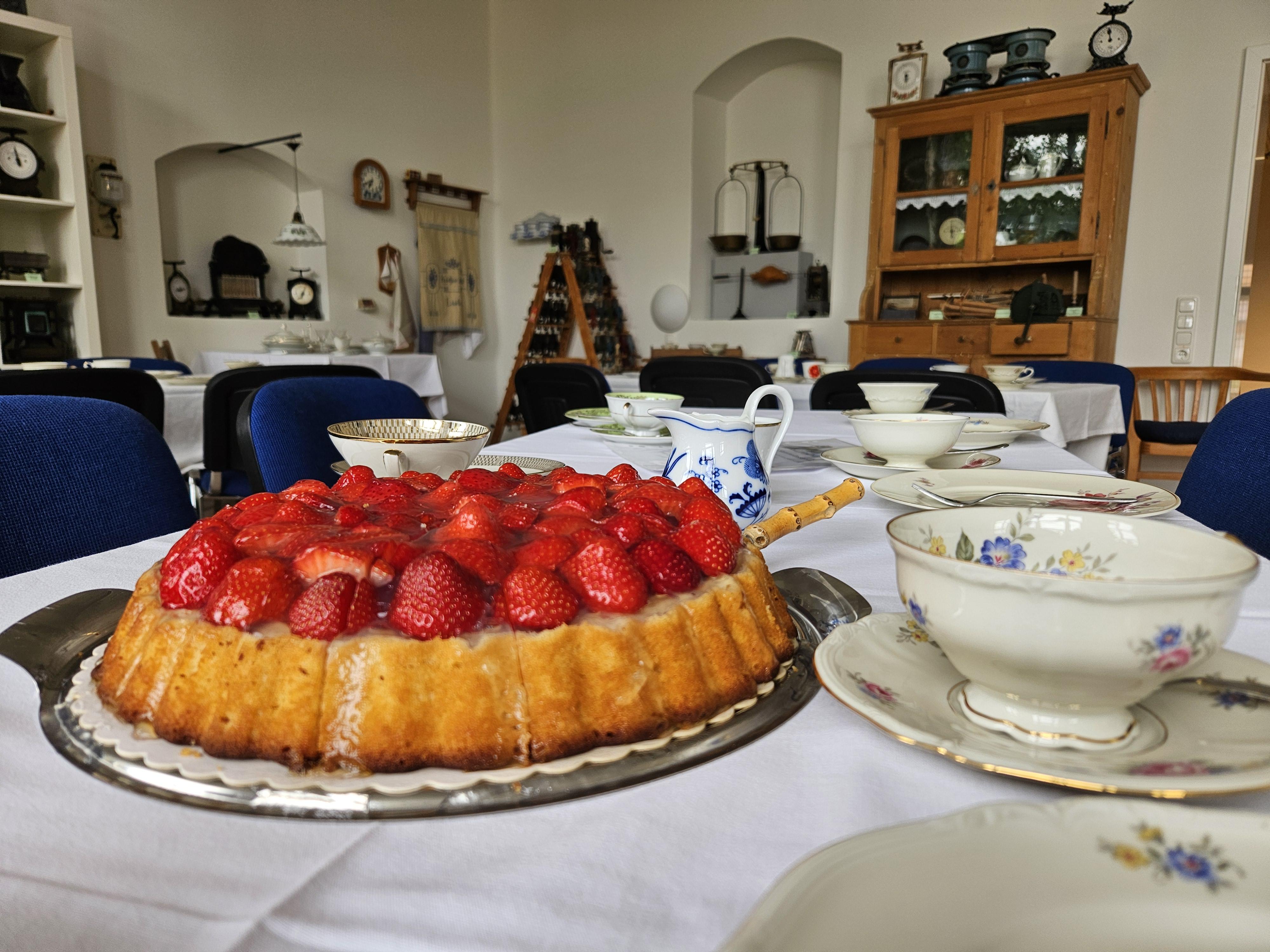Kaffee aus der Sammeltasse und selbstgemachter Kuchen, serviert auf passendem Gedeck, sorgen für eine gemütliche Atmosphäre. Dazu gibt es reichlich Gelegenheit für Austausch und Gespräche – während des Rundgangs oder beim anschließenden Verweilen. So wird Ihr Museumsbesuch zu einem rundum gelungenen Nachmittag.