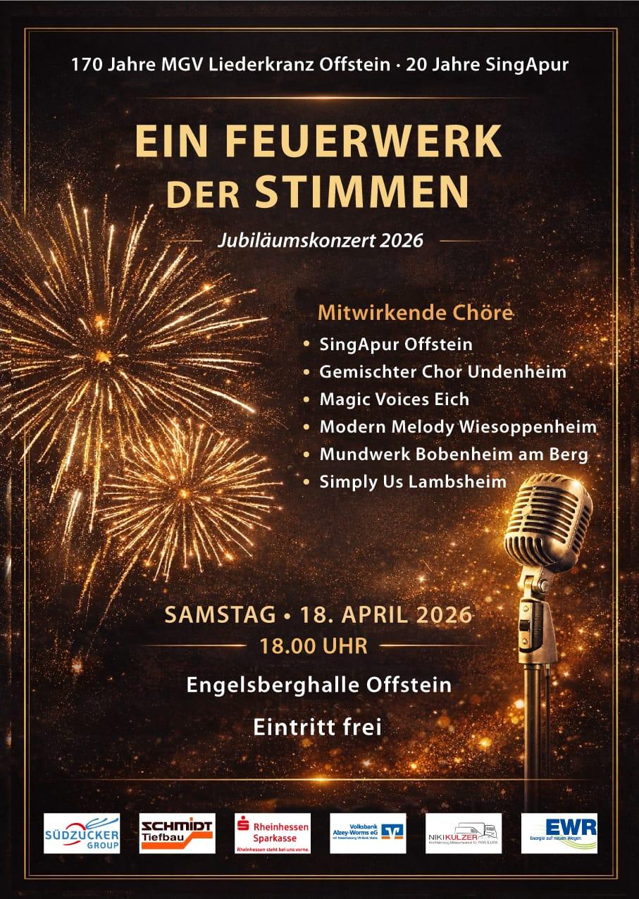 170 Jahre MGV Liederkranz Offstein e.V. und 20 Jahre SingApur - Ein Grund zum Feiern! Großes Festkonzert in der Engelsberghalle. Eintritt frei. Mitwirkende Chöre sind SingApur Offstein, gemischter Chor Undenheim, Magic Voices Eich, Modern Melody Wiesoppenheim, Mundwerk aus Bobenheim am Berg und Simply Us aus Lambsheim