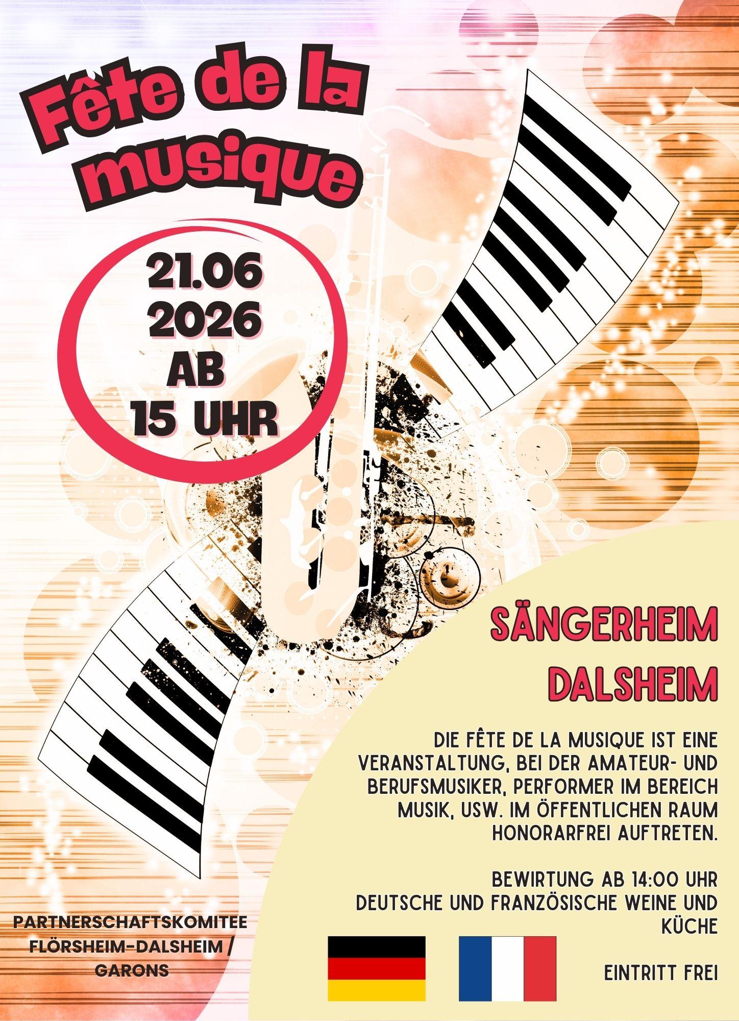 Partnerschaftskomitee Flörsheim-Dalsheim / Garons Fête de la Musique 2026 Das Partnerschaftskomitee Flörsheim-Dalsheim / Garons veranstaltet am 21. Juni 2026 eine ganz besondere Veranstaltung: die Fête de la Musique – ein musikalisches Fest im öffentlichen Raum, bei dem sich unsere Gemeinde von ihrer klingenden Seite zeigen kann. Termin: Sonntag, 21. Juni 2026 Was ist die Fête de la Musique? Die „Fête de la Musique“ (französisch für Fest der Musik ) ist eine Veranstaltung, bei der Amateur- und Berufsmusikerinnen und -musiker, Chöre, Bands, DJs und weitere musikalische Performende honorarfrei im öffentlichen Raum auftreten . Wir orientieren uns dabei am französischen Vorbild, dem mittlerweile in vielen Städten auf der ganzen Welt gefolgt wird . Einmal im Jahr verwandelt sich Frankreich in eine riesige Open-Air-Bühne , auf der alles erlaubt ist außer Stille! Ob Opernsänger auf dem Balkon, Punkbands in der Bäckerei oder Omas Akkordeontruppe im Park: Bei der Fête de la Musique darf jeder auftreten, der einen Ton trifft oder es zumindest versucht. Eintritt? Gibt’s nicht. Regeln? Kaum. Gute Laune? Garantiert! Veranstaltungsort Die Veranstaltung findet am Sonntag, 21. Juni 2026 am Sängerheim der Chorgemeinschaft in Dalsheim am Untertor statt. Genießen Sie tolle Musik in besonderer Atmosphäre und lassen Sie sich von französischen Spezialitäten , die das Partnerschaftskomitee für Sie bereithält, verwöhnen. Vive la musique – wir freuen uns auf Ihren Besuch!