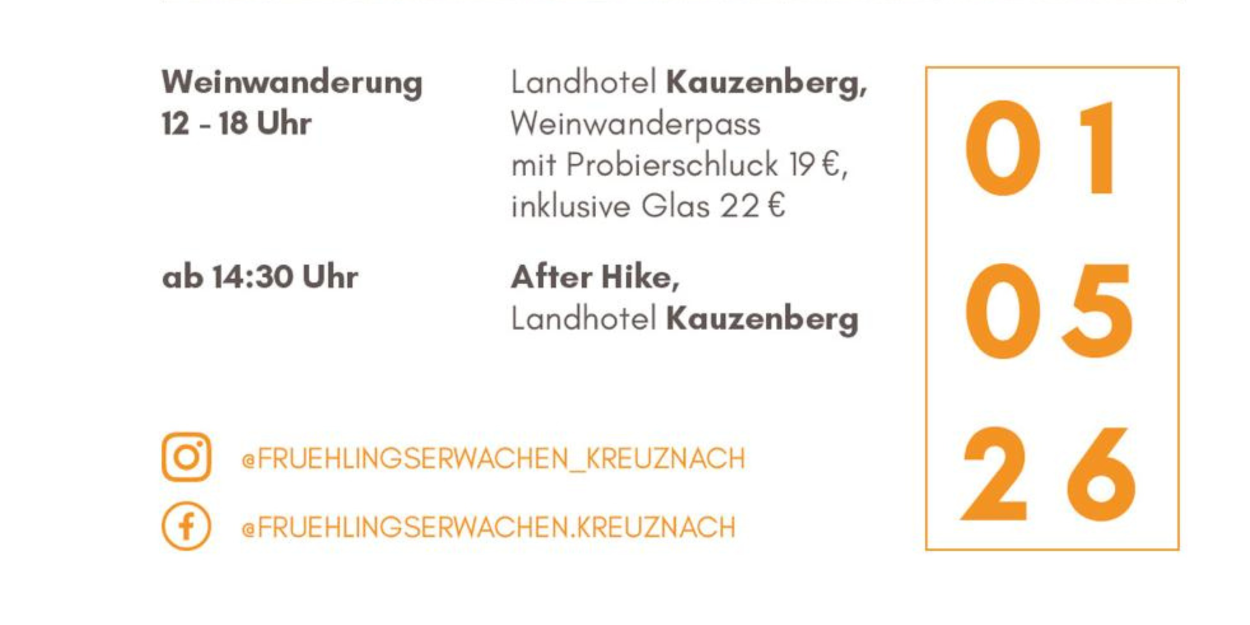 Der VFK und die GKGK präsentieren: Weinwanderung 12-18 UhrStart und Ziel: Landhotel Kauzenberg Bad KreuznachWeinwanderpass mit Probierschluck 19,00€ inkl. Glas 22,00€ab 14:30 Uhr After Hike am Landhotel Kauzenberg