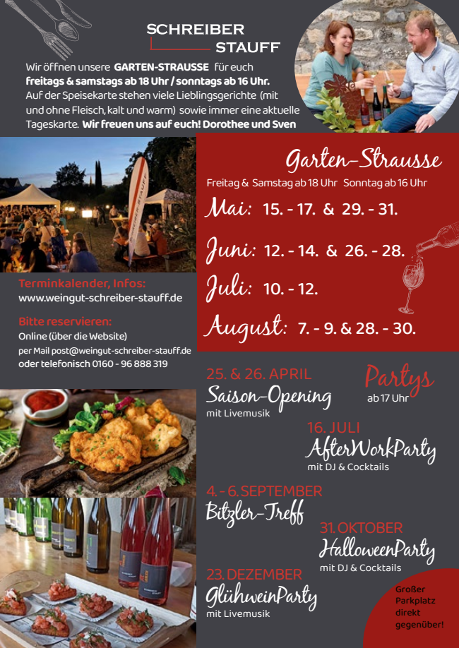 Wir öffnen unsere GARTEN-STRAUSSE für euch freitags & samstags ab 18 Uhr / sonntags ab 16 Uhr. Auf der Speisekarte stehen viele Lieblingsgerichte (mit und ohne Fleisch, kalt und warm) sowie immer eine aktuelle Tageskarte. Wir freuen uns auf euch! Dorothee und Sven
