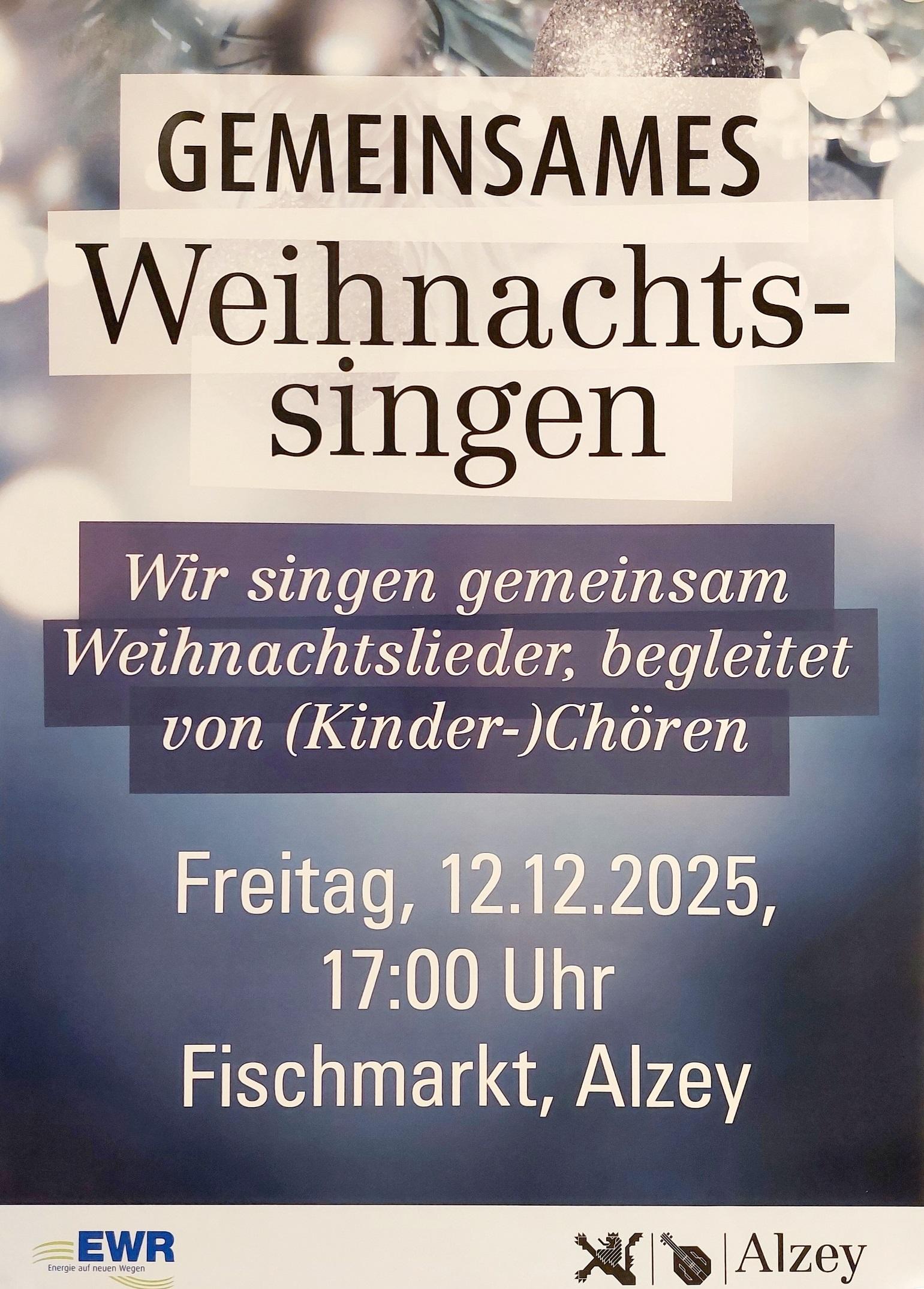 Auch dieses Jahr werden wieder zahlreiche Teilnehmerinnen und Teilnehmer zum diesjährigen Weihnachtssingen auf dem Alzeyer Fischmarkt erwartet, um sich gemeinsam auf die Festtage einzustimmen. Für rund eine Stunde wird der Fischmarkt wieder zur großen Bühne für die Alzeyer. Gesungen werden die musikalischen Klassiker der Advents- und Weihnachtszeit. "Alle Jahre wieder", "Schneeflöckchen, Weißröckchen" und "Lasst uns froh und munter sein" dürfen ebenso wenig fehlen wie "In der Weihnachtsbäckerei" und "Kling Glöckchen"