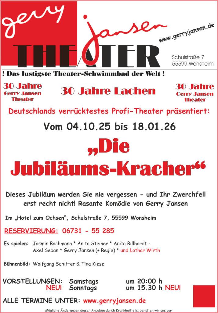 Dieses Jubiläum werden Sie nie vergessen - Ihr Zwerchfell auch nicht! Rasante Komödie von Gerry Jansen.Reservierungstelefon: 06731 55 285. Kartenpreis: 25,00 € auf allen Plätzen (Silvester 5,- EUR Aufschlag)