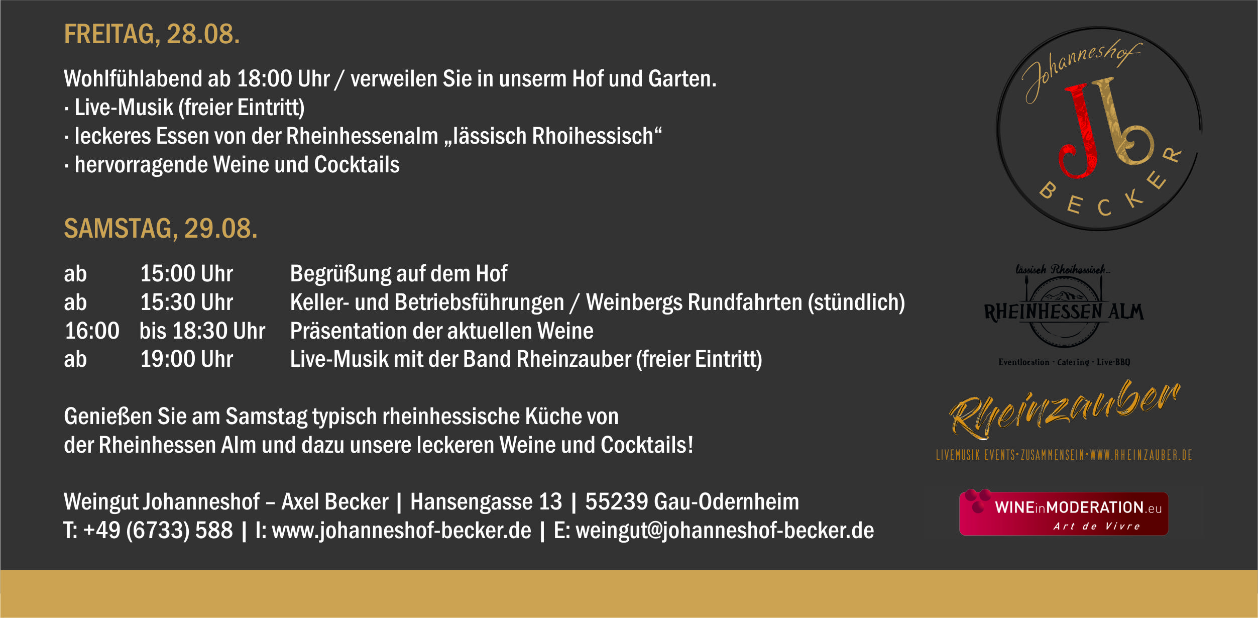 Wir laden Sie ein zu unserem Hoffest 2026 in unser Weingut Johanneshof Becker und freuen uns auf ein schönes Wochendende mit Ihnen. Genießen Sie bei Live-Musik, gutem Essen und leckeren, rheinhessischen Weinen zwei schöne sommerliche Abende.