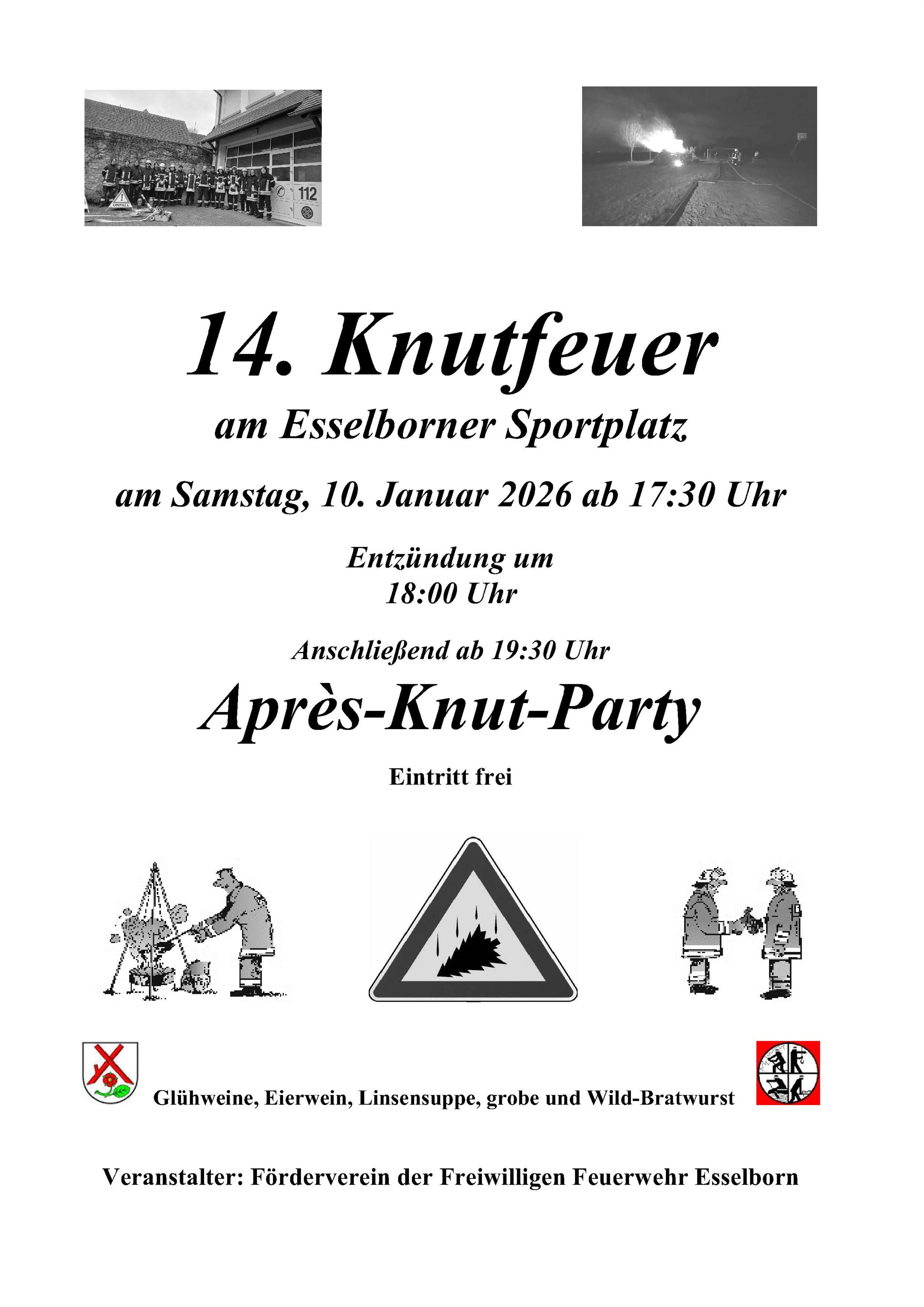 Knutfeuer des Fördervereins und der Feuerwehr Esselborn ab 17:30 Uhr auf dem Esselborner Sportplatz mit anschließender Apres-Knut-Party.Entzündung des Feuers um 18:00 Uhr.