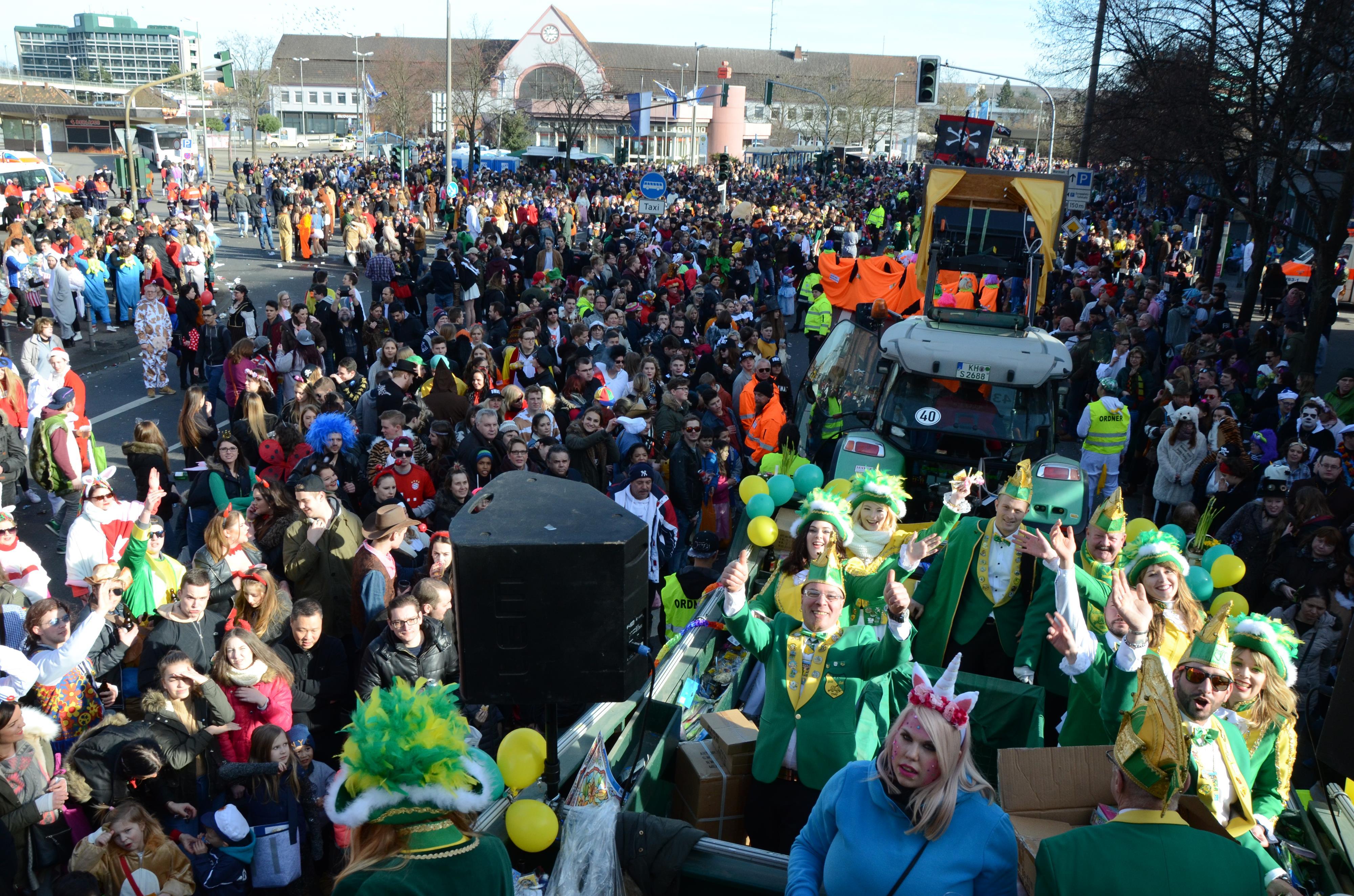 ...zu den Bad Kreuznacher Schlachtrufen "Allez Hopp", "Helau", "Schupp-La" und "Ahoi" zieht es alljährlich viele tausend Zuschauer in die Innenstadt. Zum Ausklang laden die Bad Kreuznacher Vereine zu einer Party auf den Kornmarkt ein. Hier werden die besten Fußgruppen und die originellsten Festwagen ausgezeichnet. Die Anreise mit öffentlichen Verkehrsmitteln wird dringend empfohlen da die Innenstadt für den Durchgangsverkehr gesperrt ist. Die Zugstrecke findet sich unter www.kreiznacher-narrefahrt.de/zugstrecke/