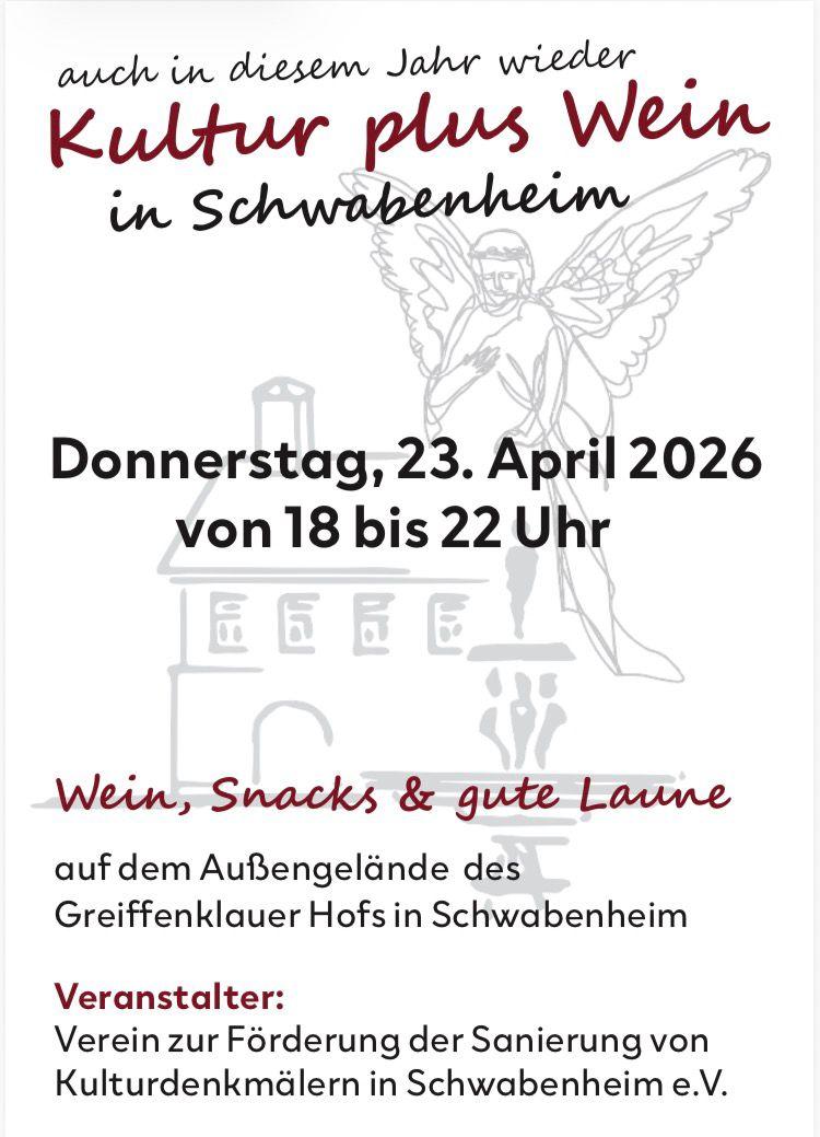 Auch in diesem Jahr lädt Schwabenheim wieder zu „Kultur plus Wein“ ein! Genießt einen Abend voller Kultur, köstlichem Wein, leckeren Snacks und guter Laune in gemütlicher Atmosphäre.