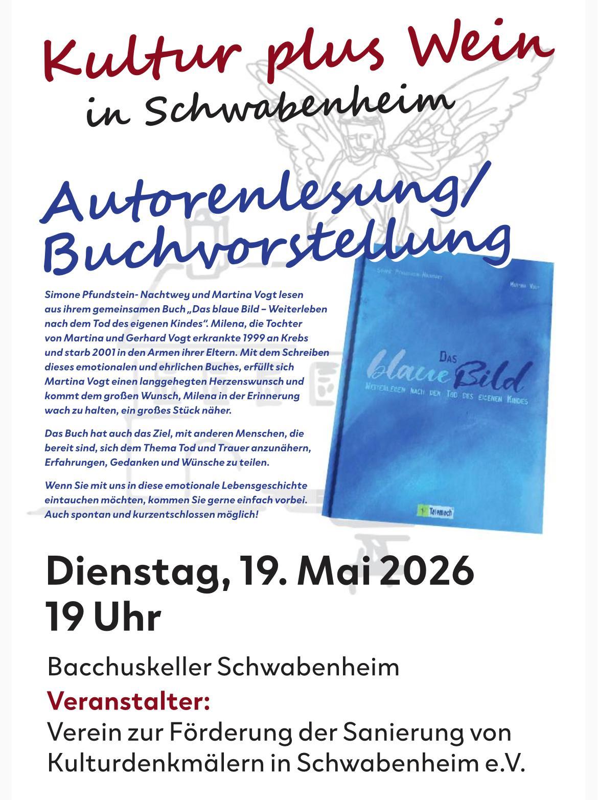 Im Rahmen der Reihe „Kultur plus Wein in Schwabenheim“ laden Simone Pfundstein-Nachtwey und Martina Vogt zu einer bewegenden Autorenlesung mit Buchvorstellung ein. Vorgestellt wird ihr gemeinsames Buch „Das blaue Bild – Weiterleben nach dem Tod des eigenen Kindes“.