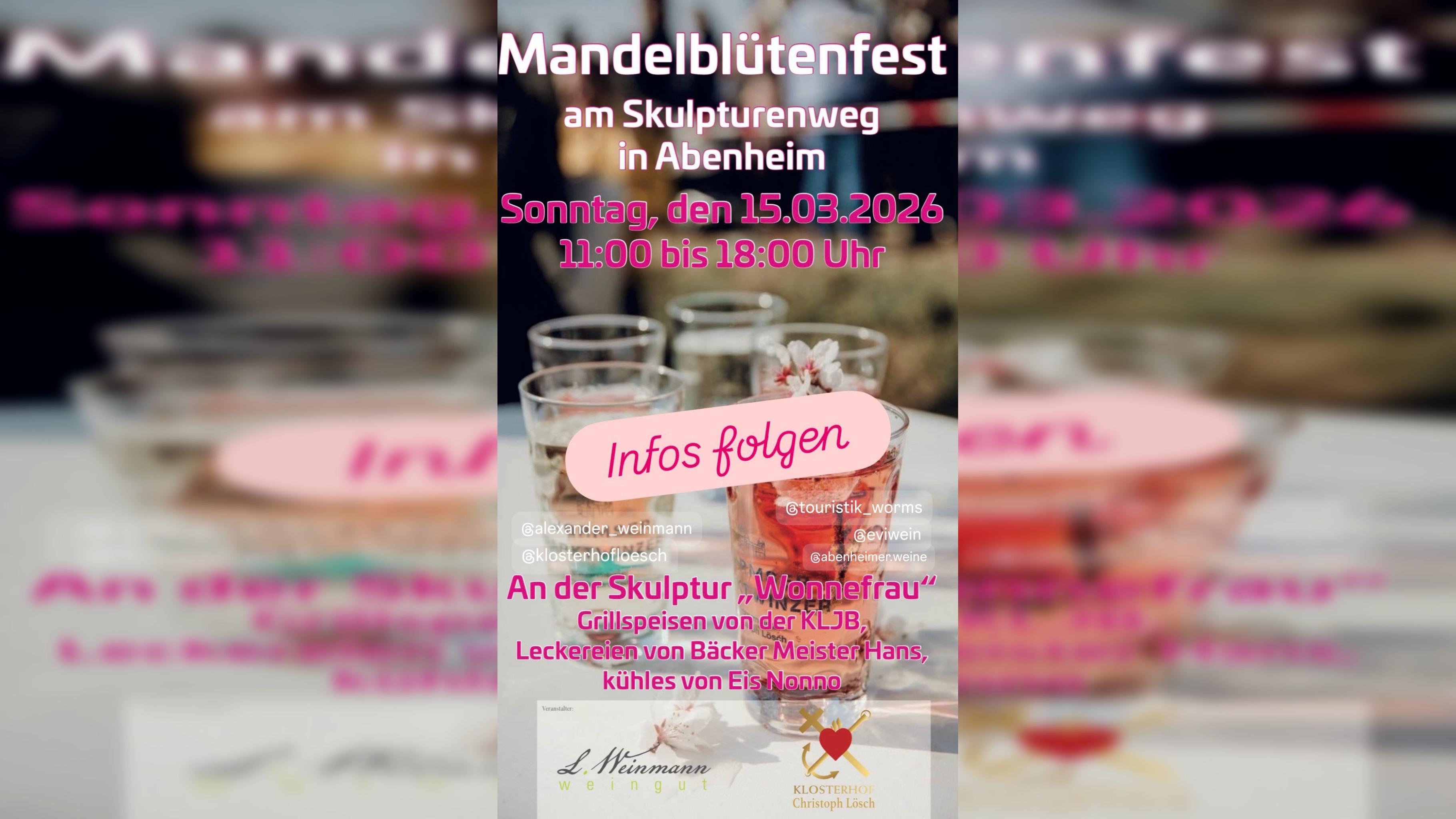 Im rheinhessischen Wonnegau zieht der Frühling etwas früher ein. Mit den zarten Blüten der Mandelbäume entlang des Skulpturenweges bringen die Winzer Weinmann und Lösch die ersten 25 er Weine zum Ausschank. Vor allem in der Farbe der Saison: Rosa! Gäste können die Skulpturen auf dem beschilderten Rundweg in den Weingärten die Kunst werke bestaunen. Für das leibiche Wohl sorgt die kath. Landjugend mit Grillwaren von der örtlichen Metzgerei Schwahn, Die Bäckerrei Meiserhans aus Bobenheim-Roxheim mit Kuchen und Backwerk und Eis serviert das Wormser Unternehmen Eis Nonno