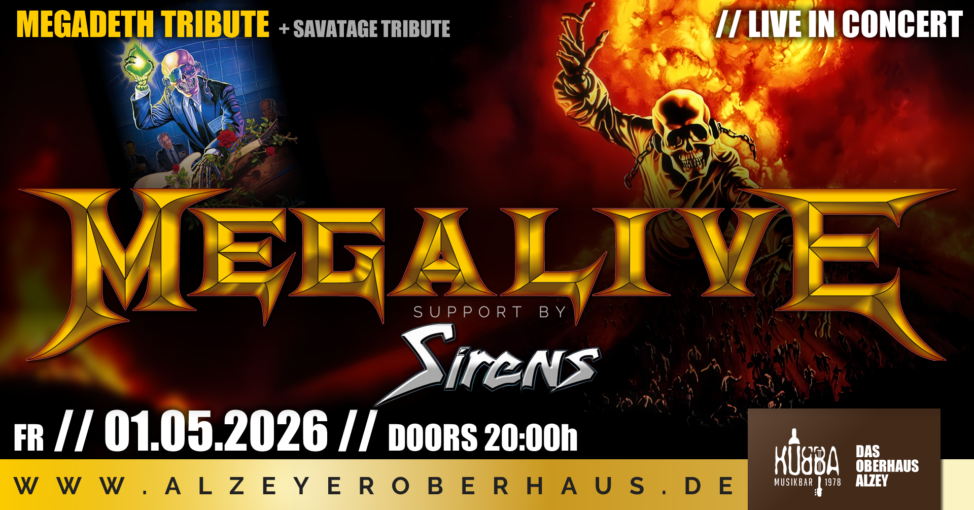 MEGALIVE bringen seit 2020 das energiegeladene Live-Feeling von MEGADETH mit halsbrecherischen Gitarrensoli und anspruchsvollen Arrangements als Tribute-Act auf die Bühne. Als einzige Formation dieser Art in Deutschland schließen sie die Lücke zwischen anderen Tribute Bands und bedienen dabei sowohl Hits als auch selten gespielte Schätze. Infos auf www.alzeyeroberhaus.de oder im Kubba