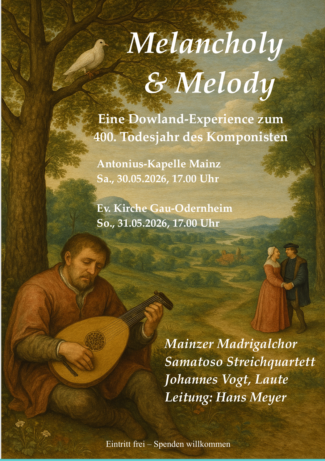 Die ausführenden Ensembles streben keine historische Aufführungspraxis an, sondern möchten eine Abbreviatur des außergewöhnlichen Schaffens des zu Unrecht vernachlässigten Komponisten dem heutigen Publikum klangvoll und abwechslungsreich präsentieren. John Dowland (1563-1626) war einer der bedeutendsten englischen Komponisten des elisabethanischen Zeitalters im Übergang von der Renaissance zum Barock. Ab 1597 veröffentlichte er in Abständen seine drei „Books of Songs or Ayres“, eine Sammlung von Liedern, die sowohl solistisch mit Lautenbegleitung als auch im vierstimmigen Vokalensemble aufgeführt werden konnten.
