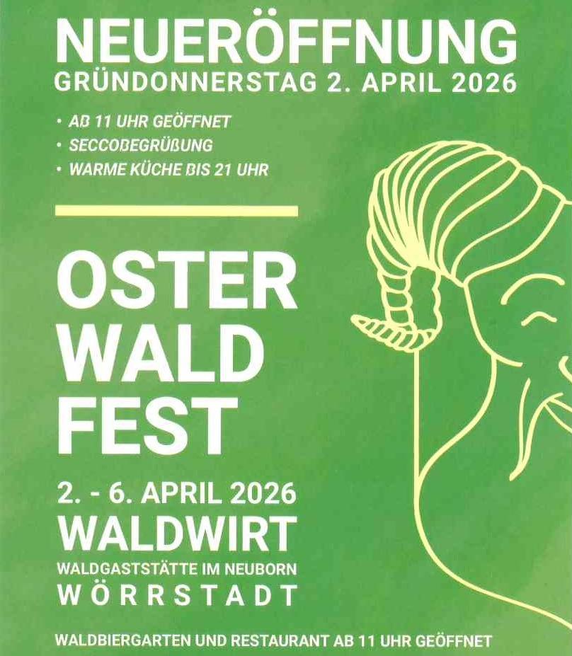 Im Rahmen des Osterwaldfests vom 2. bis 6. April 2026 lädt der Waldwirt in der Waldgaststätte im Neuborn in Wörrstadt zu entspannten Stunden im Grünen ein. Ob im idyllischen Waldbiergarten oder im Restaurant – lassen Sie sich kulinarisch verwöhnen und erleben Sie die Osterfeiertage in besonderem Ambiente. Wir freuen uns auf Ihren Besuch!