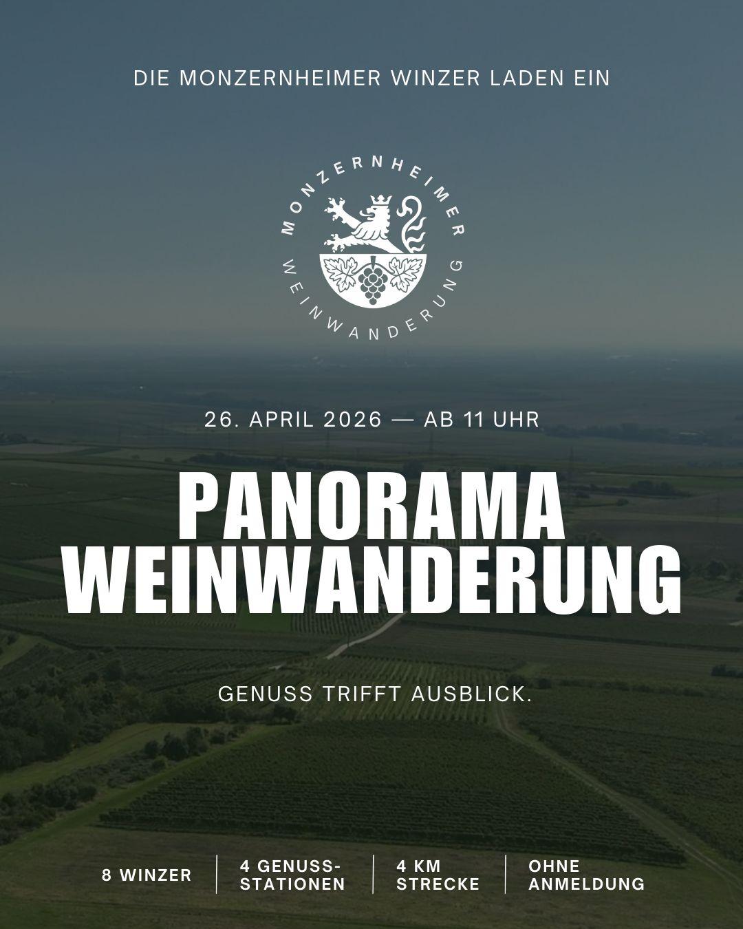 Die Monzernheimer Winzer laden euch zur Panorama Weinwanderung ein – mit traumhaften Ausblicken, richtig guten Weinen & leckerem Essen. Das erwartet euch: 4 Genuss- Stationen mit Wein & Kulinarik, 8 Winzer, eine Strecke, viele Highlights, ca. 4 km durch die schönsten Lagen. Entspanntes Weinwandern mit Panorama-Faktor. Festes Schuhwerk empfohlen. Start: Gemeindehalle Monzernheim