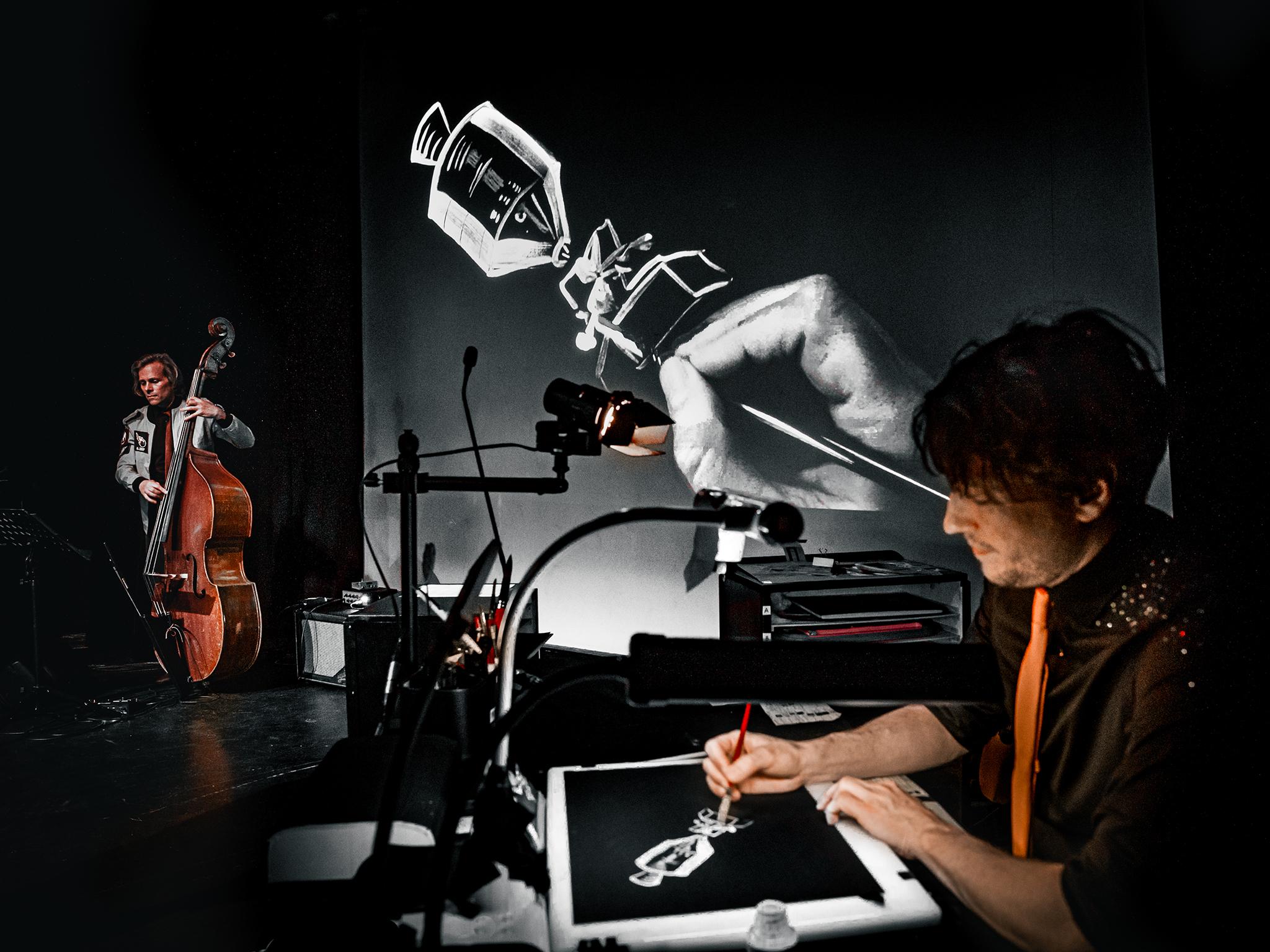 In einer Kombination aus Live–Zeichnungen, Musik und Schauspiel nehmen die vier Künstler das Publikum mit auf eine außergewöhnliche Reise ins All: Robert Nippoldt sitzt an einem Tisch, einer Art Kreativkonsole, dessen Arbeitsfläche von einer Kamera live auf eine große Leinwand im Hintergrund projiziert wird.