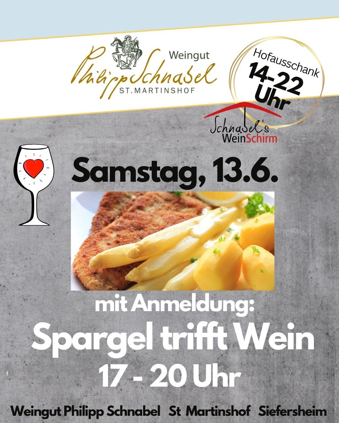 Unser beliebter Hofausschank am WeinSchirm öffnet an diesem Samstag ab 14 Uhr. Nach Hiwwel-Wanderung oder Radtour können Sie sich hier im St. Martinshof erfrischen und eine Pause im Liegestuhl einlegen. Die Küche mit leckeren Spargel-Gerichten (Spargelsuppe, Spargel-Schnitzel, Spargelsalat) öffnet von 17-20 Uhr, wir bitten um Anmeldung zum Essen.