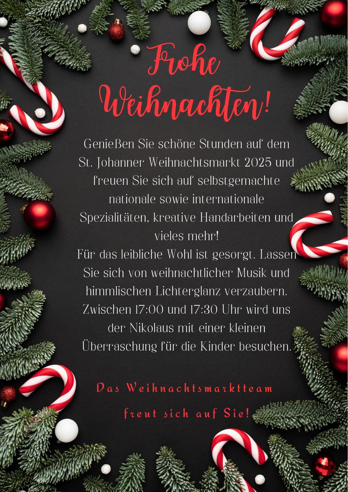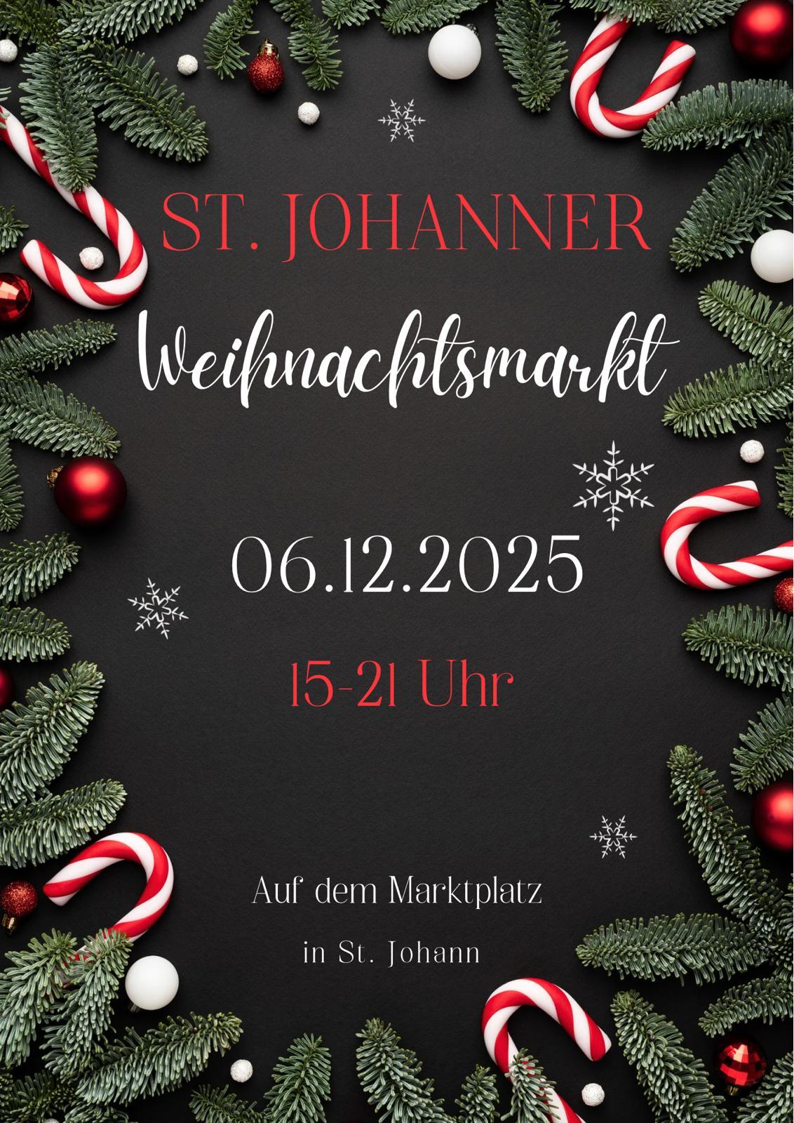 Der Markt findet am 6. Dezember 2025 von 15 bis 21 Uhr in St. Johann statt. Es gibt Stände mit Kunsthandwerk, regionale Speisen, Weihnachtsdekoration, Glühwein, Bratwurst und Süßes. Musik, Familienangebote und eine gemütliche Atmosphäre runden das Programm ab. Der Nikolaus kommt zwischen 17 und 17.30 Uhr zu Besuch.