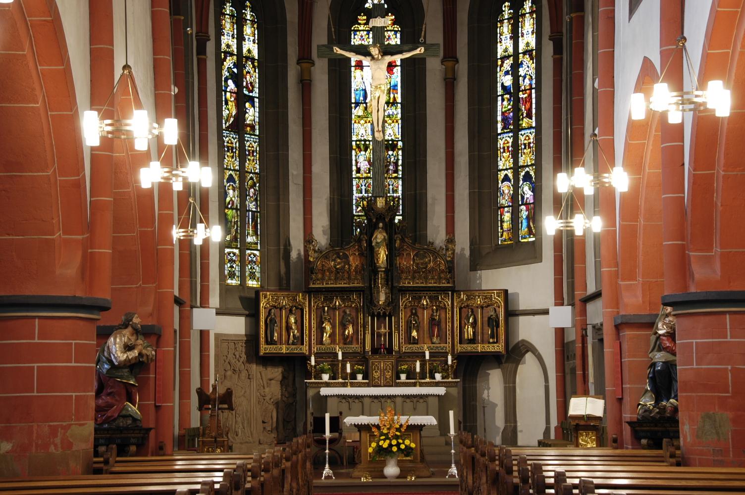 Sie war von den Sponheimer Grafen gestiftet worden und diente 500 Jahre den Karmelitern als Ordenskirche. Neben mittelalterlichen Grabdeckplatten, dem Kreuzreliquiar und einem Hungertuch von 1584 ist die barocke und neugotische Ausstattung zu betrachten, zu der auch die zahlreichen Buntglasfenster aus der Zeit um 1900 gehören.