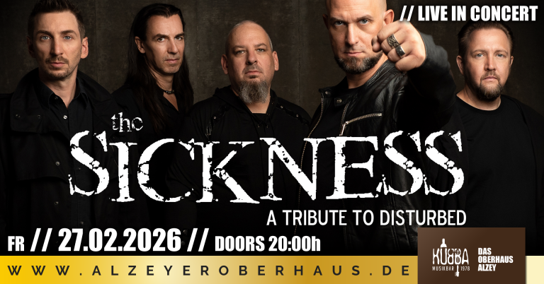 The Sickness ist eine hochenergetische Tribute-Band, die sich ganz der Musik von Disturbed verschrieben hat. Mit ihrem mitreißenden Bühnenauftritt und ihrer unverkennbaren Leidenschaft für das Original schaffen sie es, die unverkennbare Essenz von Disturbed auf die Bühne zu bringen. Die Setliste von The Sickness umfasst eine breite Palette von Hits und Fan-Favoriten, darunter Klassiker wie „Down with the Sickness“, „Stricken“, „Indestructible“ und natürlich den Megahit „The Sound of Silence“. Mit beeindruckender Präzision und Energie interpretieren sie die Songs von Disturbed und lassen das Publikum in eine Welt voller kraftvoller Riffs, emotionaler Texte und mitreißender Melodien eintauchen. The Sickness bringen auf eine eindrucksvolle Weise die Musik auf die Bühne, in dem sie ihre Leidenschaft und Energie für Disturbed mit ihrem Publikum teilen.